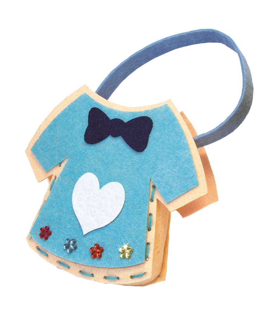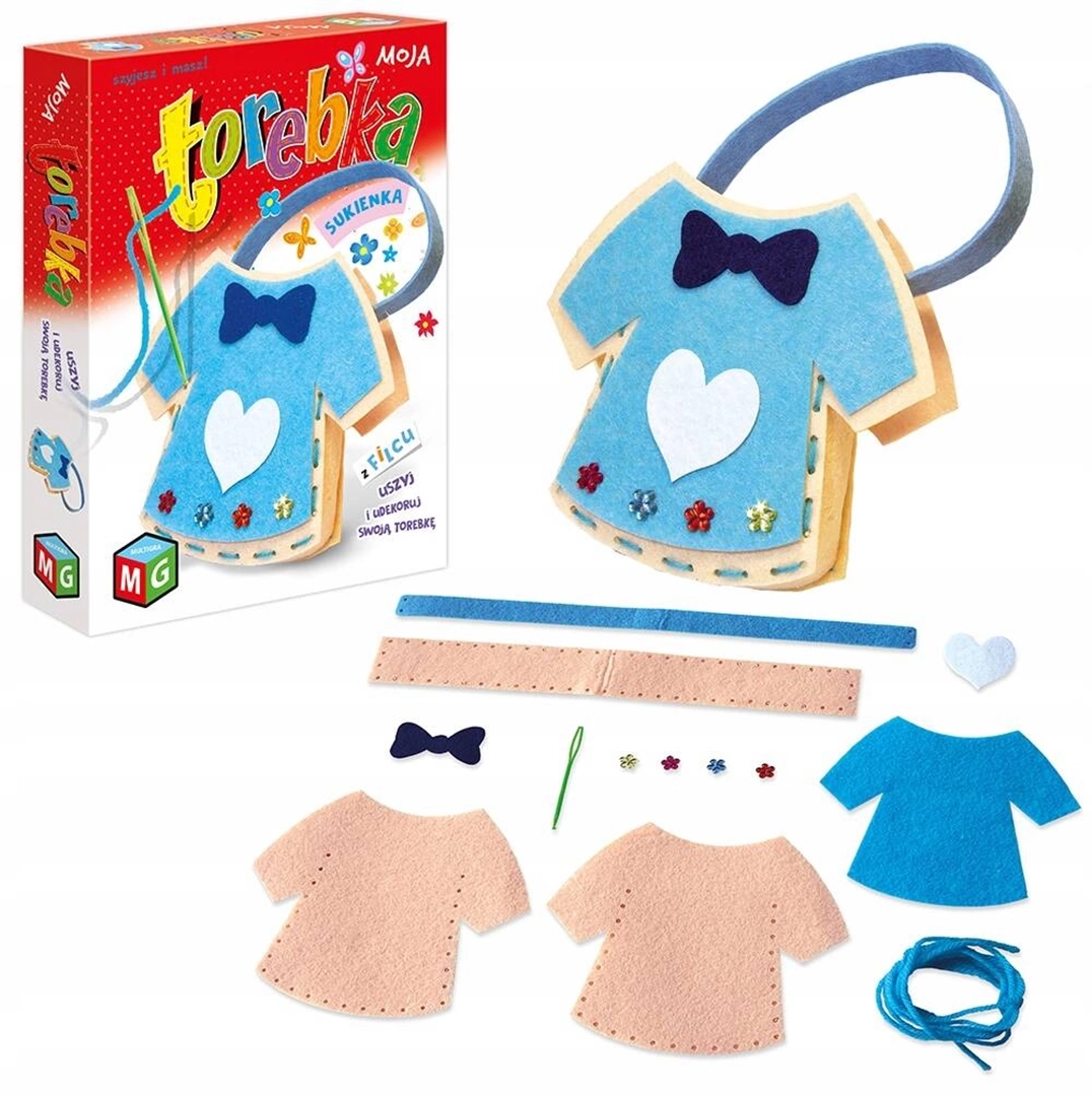Zestaw kreatywny do szycia torebki w kształcie sukienki. Idealny dla dzieci 5+, rozwijający kreatywność i zdolności manualne.