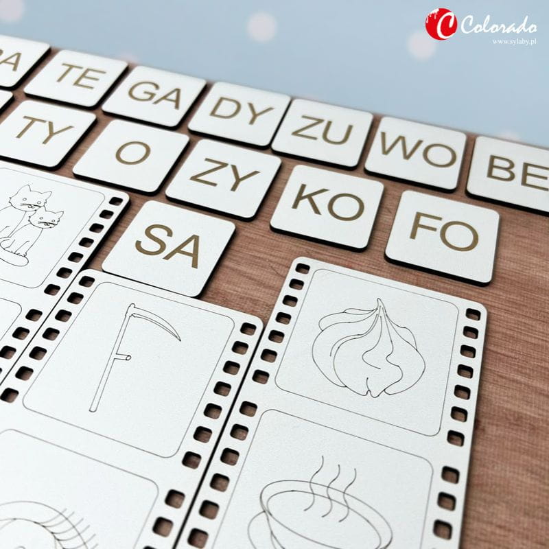 Jednym ze sposobów na ułatwienie dziecku nauki czytania jest zastosowanie niezwykle skutecznej metody sylabowej. Przydatnym narzędziem umożliwiającym jej wdrożenie nawet podczas zabawy jest sylabowy aparat fotograficzny, a jego funkcjonalność można rozszerzać dzięki kilku dostępnym w naszej ofercie dodatkom takim jak ten. Wprowadzając do podstawowego zestawu cztery kolejne klisze z obrazkami (wozy, foka, waza, koty, teka, waga, kosa, oko, kiwi, beza, zupa, gady), a także płytki z sylabami (osiemnaście sztuk) można zwiększyć potencjał edukacyjny. Dodatek nie zawiera bazy, jaką jest sylabowy aparat fotograficzny, dzięki czemu nie będą się odkładać niepotrzebne kopie podczas rozszerzania zestawu. Wykonane z płyty HDF elementy są bardzo trwałe i posłużą przez długi czas. Zestaw przeznaczony jest dla dzieci, które ukończyły trzeci rok życia. W ofercie znajdują się również inne dodatki, dzięki czemu można stopniowo dokładać kolejne słowa i sylaby.