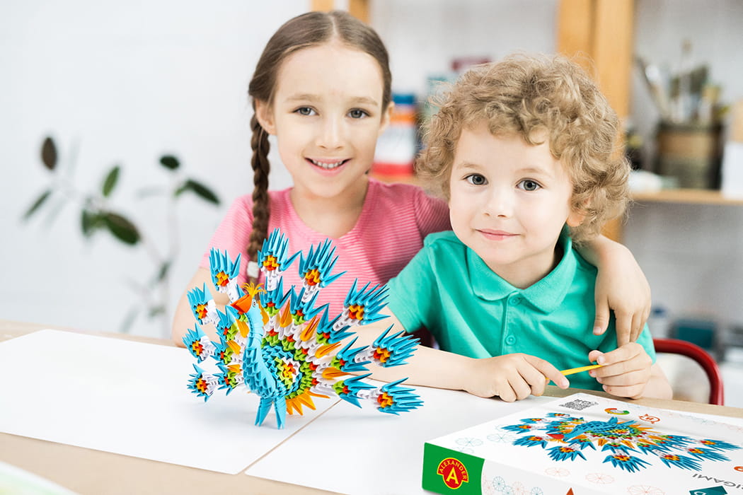 Składanie Origami 3D – Paw rozwija cierpliwość, precyzję, kreatywność oraz zdolności manualne. To doskonała zabawa dla dzieci, która może stanowić także oryginalny pomysł na prezent czy ozdobę wnętrza. Po złożeniu, gotowy model może być eksponowany jako efektowna dekoracja pokoju dziecięcego.