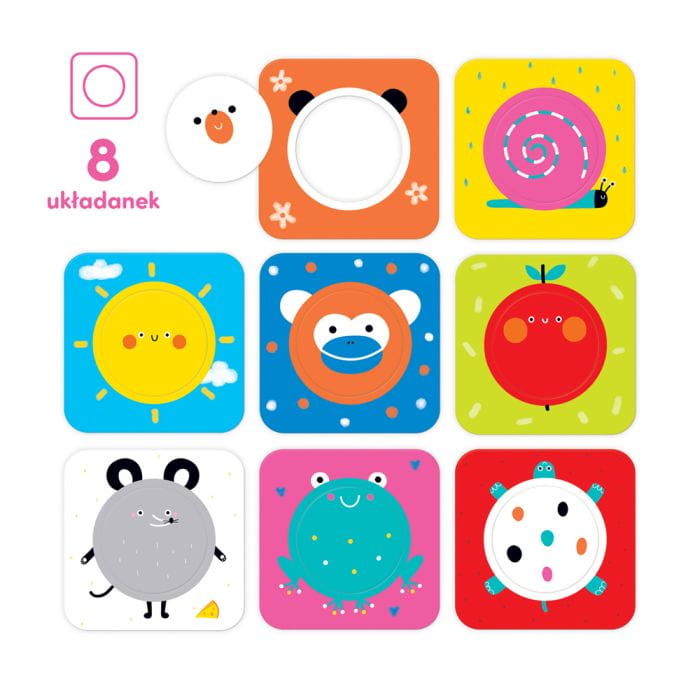 8 plansz ze znanymi maluchowi obrazkami, takimi, jak słońce, jabłko czy wizerunki zwierzątek, łączy jeden element: wyjmowany środek w kształcie koła. Maluch musi wytężyć umysł, by dopasować wycinek do właściwej planszy, a konieczność włożenia koła do otworu dodatkowo pobudza motorykę pociechy. Gra uczy, bawi i daje pole do przedstawiania dziecku dodatkowych zagadnień: np. nazw zwierząt.