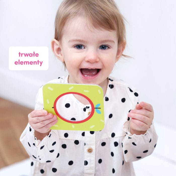 Gra jest w pełni bezpieczna dla maluchów: elementy wykonane zostały z solidnej tektury, a ich rozmiar jest na tyle duży, że nie występuje ryzyko zadławienia. Stanowi świetny pomysł na prezent dla brzdąca, który niebawem skończy rok!