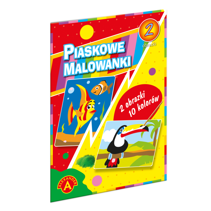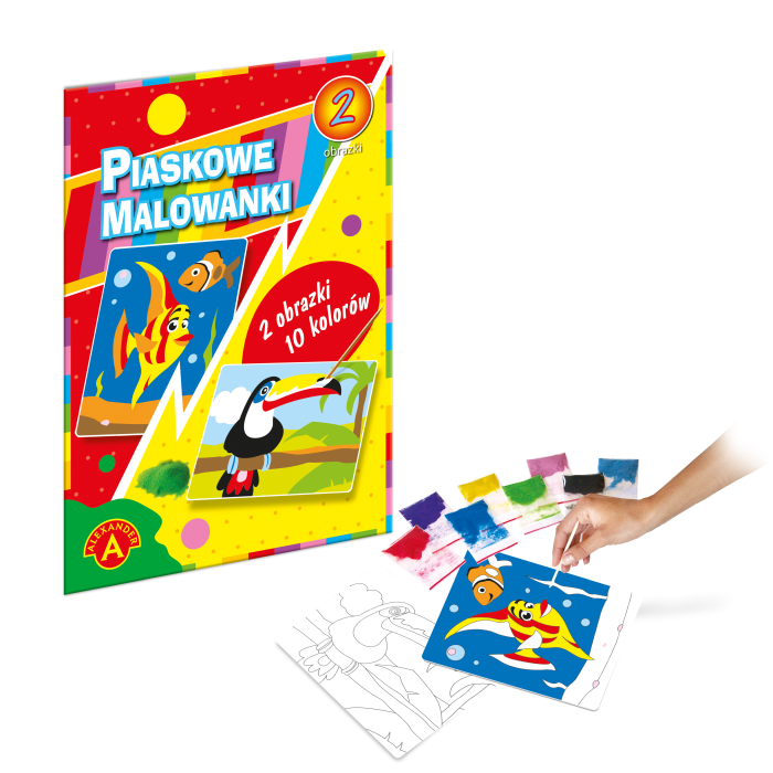 Piaskowe Malowanki – Rybka, Tukan to zabawka kreatywna od Alexander, która łączy zabawę z edukacją. W zestawie znajdują się dwa obrazki do kolorowania, patyczek, 11 woreczków z kolorowym piaskiem oraz instrukcja. Zabawa polega na odsłanianiu kolejnych elementów obrazka, odsłaniając klejącą powierzchnię, którą następnie posypuje się piaskiem w odpowiednich kolorach.
