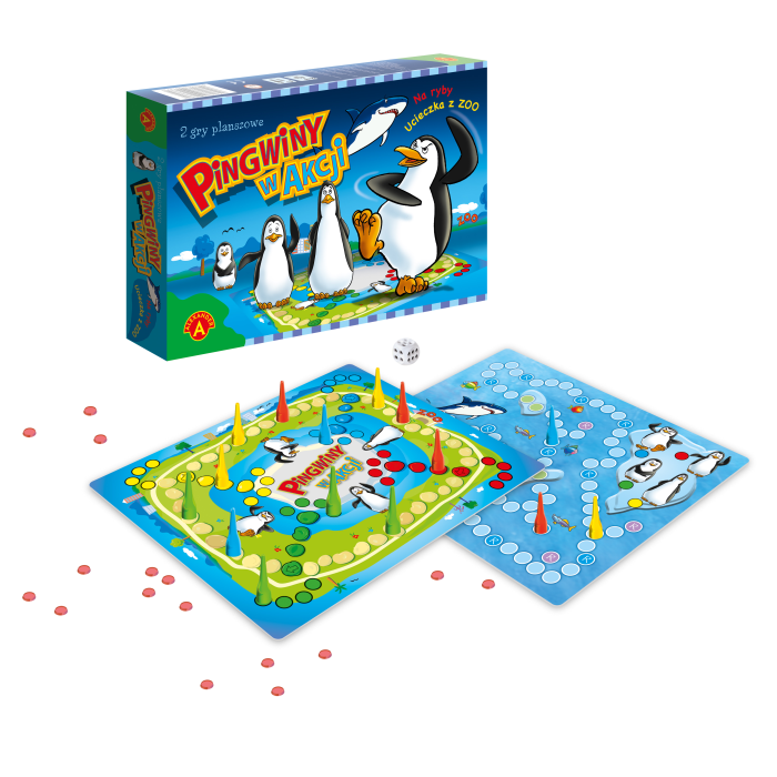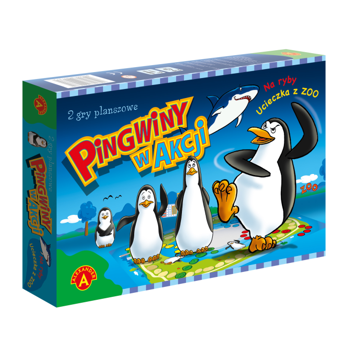 „Pingwiny w Akcji” to dwie gry planszowe w jednym pudełku. W Ucieczce z ZOO gracze pomagają pingwinom wydostać się na wolność, a w grze Na ryby rywalizują o jak największy połów, unikając groźnego rekina.