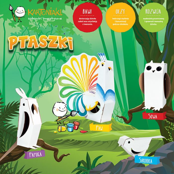 - Zawiera zestaw kartonowych ptaszków, które można złożyć i udekorować.