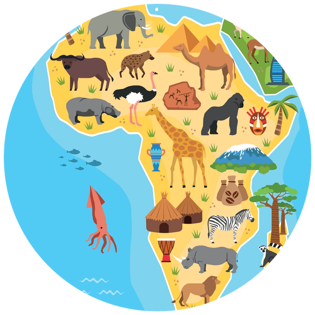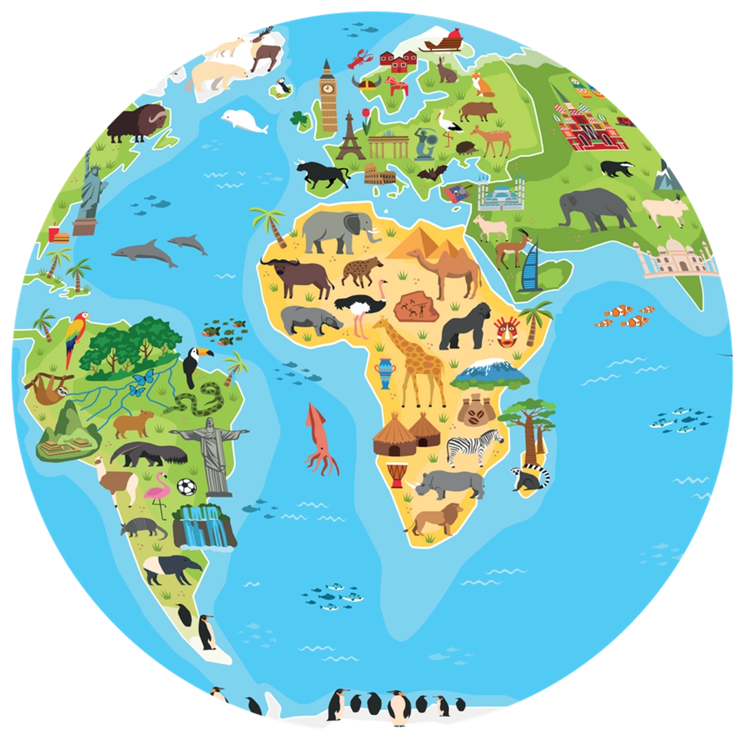 - Motyw: Kolorowe kontynenty z charakterystycznymi zwierzętami