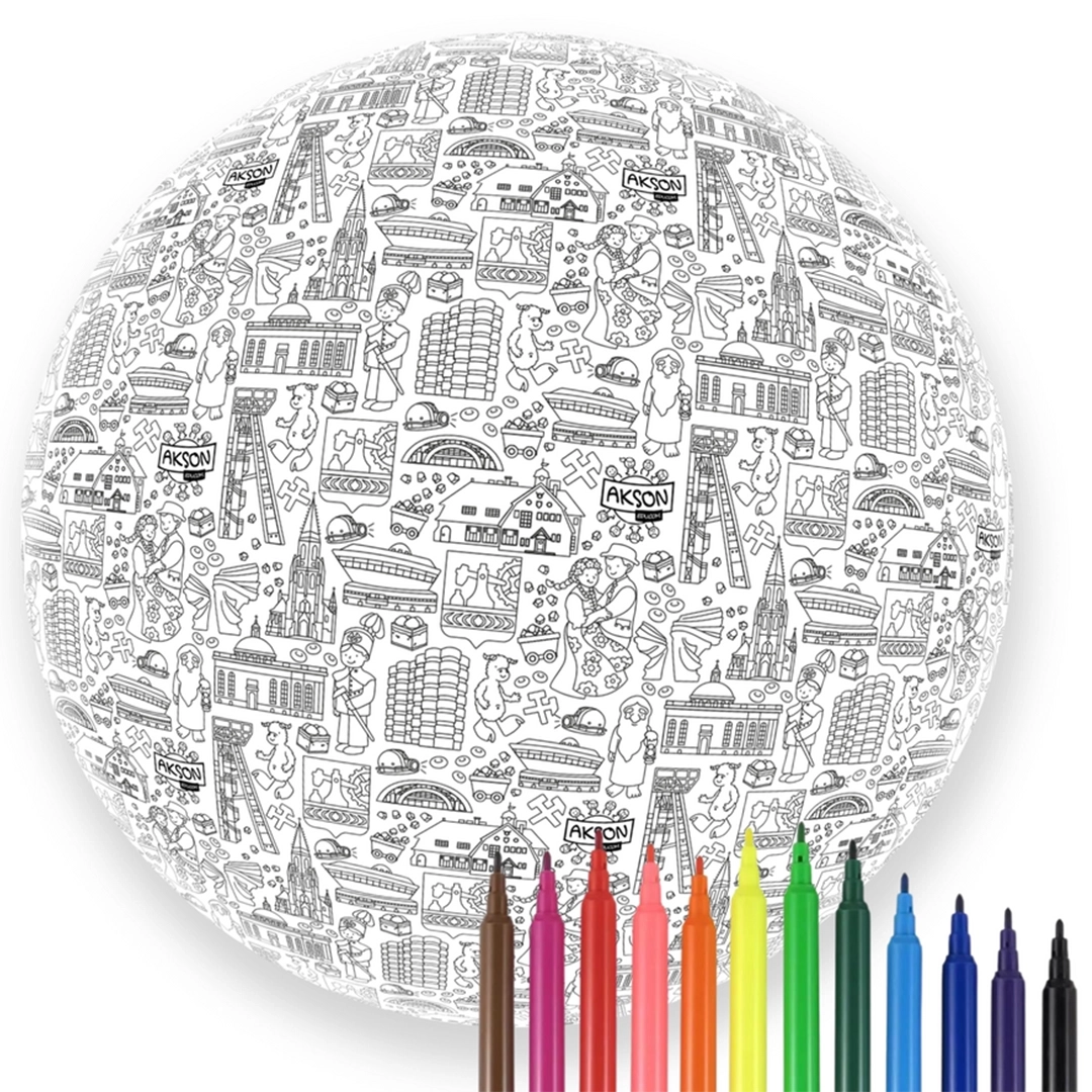 Piłka Balonowa do kolorowania XXL Akson seria miasta: KATOWICE to edukacyjna zabawka łącząca aktywność fizyczną z kreatywną nauką o Katowicach. Zestaw zawiera materiałową piłkę o średnicy 85 cm z wymiennym balonem, 2 dodatkowe balony oraz 12 spieralnych pisaków do samodzielnego kolorowania.