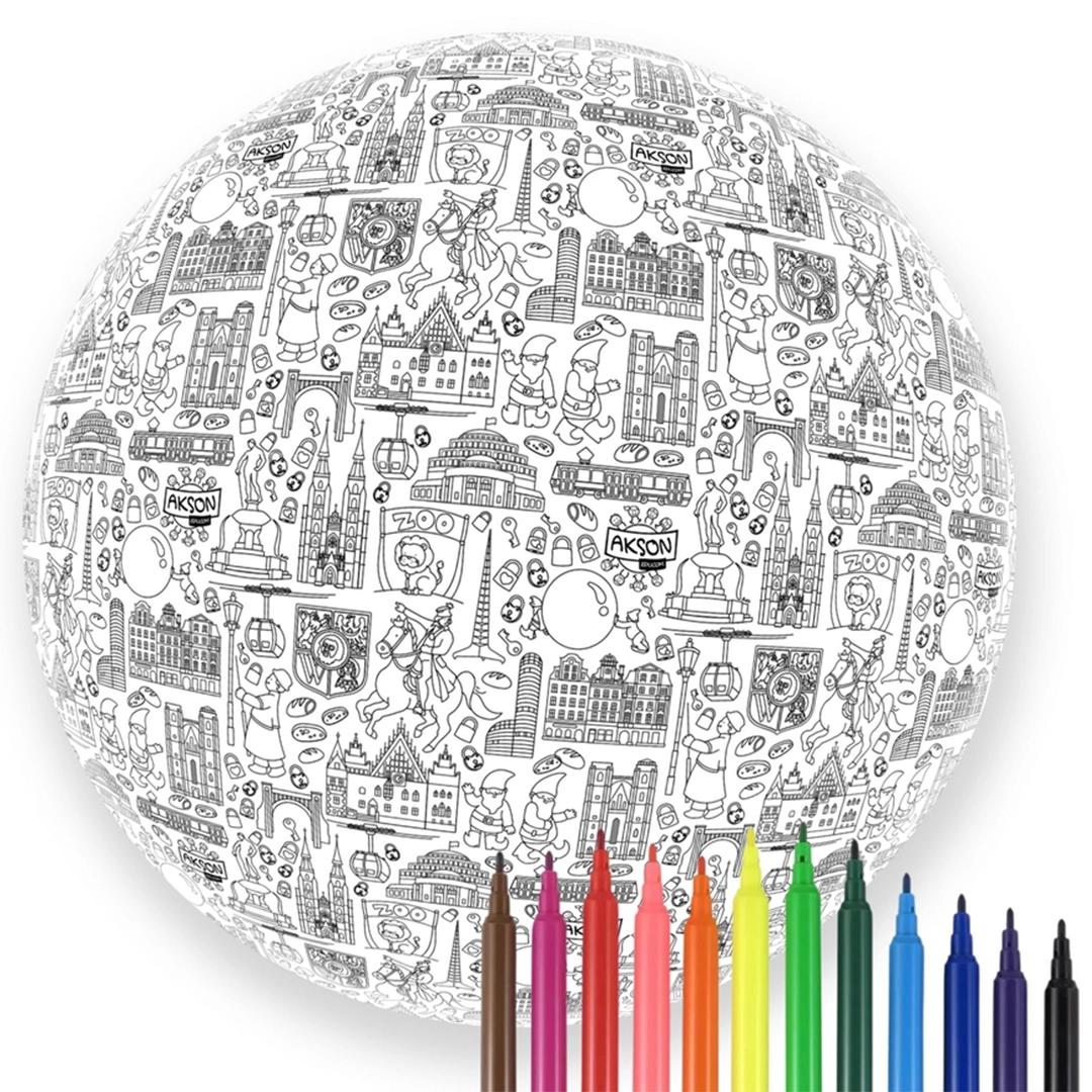 Piłka Balonowa do kolorowania XXL Akson seria miasta: WROCŁAW to edukacyjna zabawka łącząca aktywność fizyczną z kreatywną nauką o Wrocławiu. Zestaw zawiera materiałową piłkę o średnicy 85 cm z wymiennym balonem, 2 dodatkowe balony oraz 12 spieralnych pisaków do samodzielnego kolorowania.
