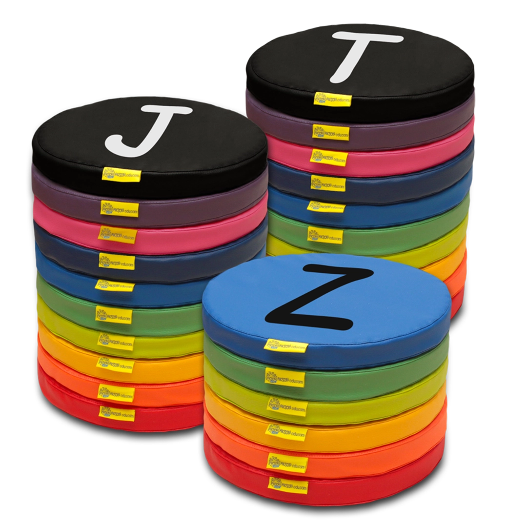 Poduszki KODURA zestaw ALFABET A-Z to trwałe i kolorowe poduszki edukacyjne, które wspierają naukę liter i zabawy ruchowe w przedszkolu i szkole.