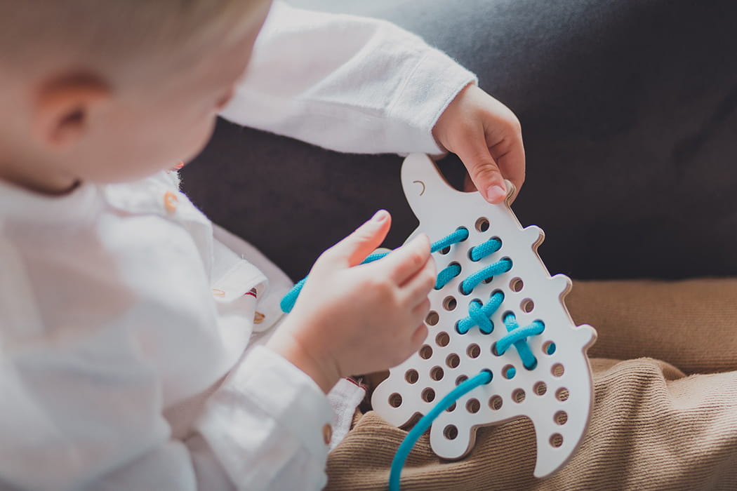 Drewniana przeplatanka dla dzieci Dinozaur Antek - sensoryczna zabawka zręcznościowa do motoryki małej