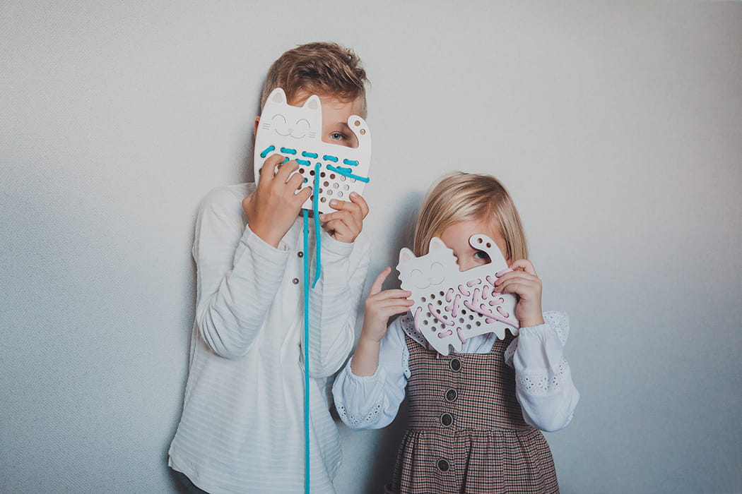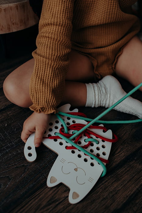 Drewniana przeplatanka dla dzieci Kotka Renia - sensoryczna zabawka zręcznościowa do motoryki małej