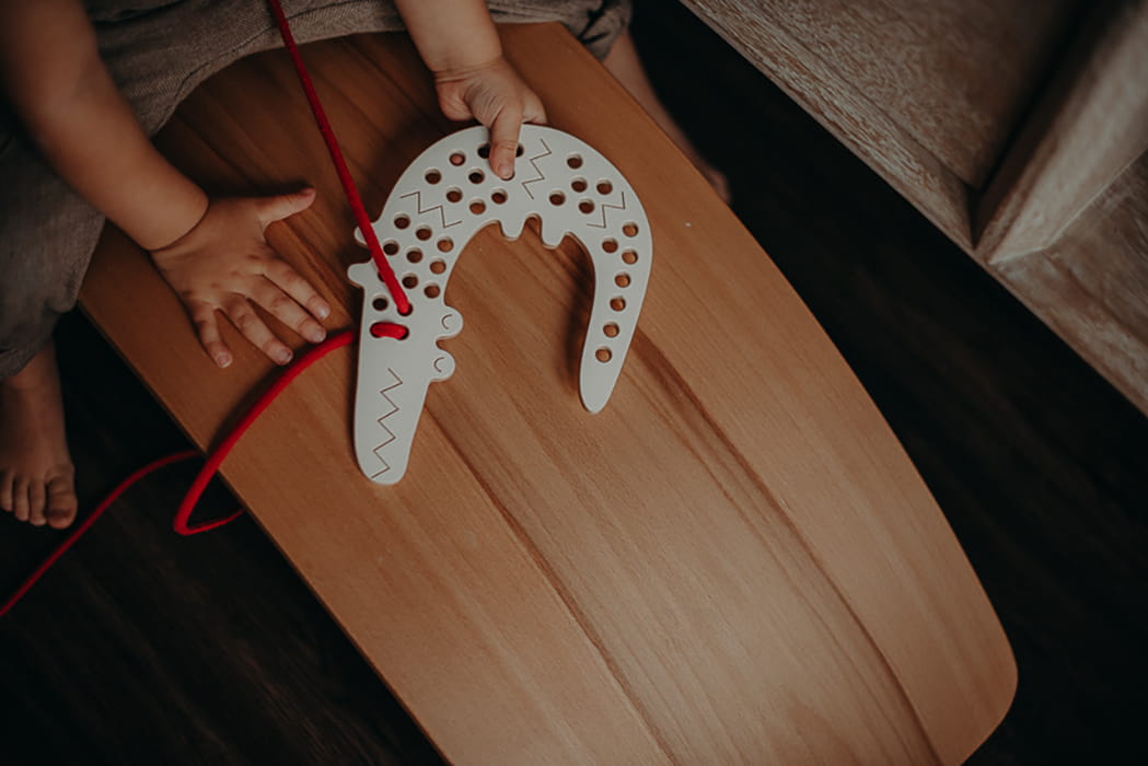 Drewniana przeplatanka dla dzieci Krokodyl Felek - sensoryczna zabawka zręcznościowa do motoryki małej