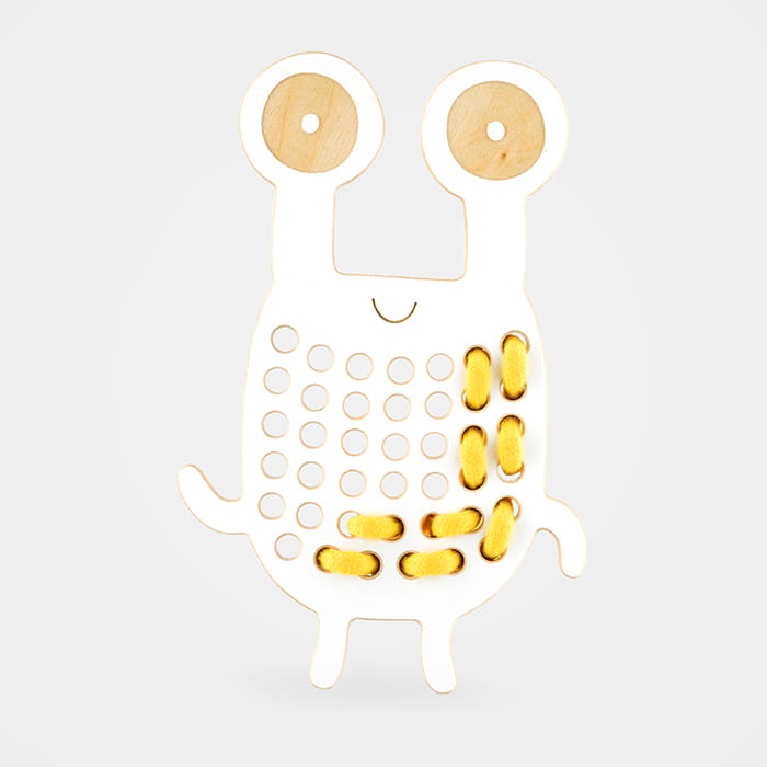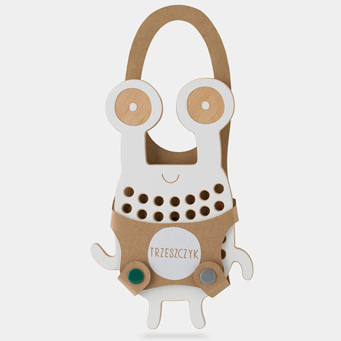 Kto tak wesoło spogląda, łapką macha i zachęca do zabawy? To Trzeszczyk! To bardzo sympatyczne stworzenie, które nie tylko chętnie pobawi się z Twoim dzieckiem, ale przy okazji nauczy go nowych rzeczy i pomoże utrwalić jego umiejętności. Trzeszczyk jest drewnianą przeplotką, czyli zabawką, która służy do przeciągania sznurówki lub sznurka przez otwory. W ten sposób można tworzyć wiele unikalnych, ciekawych wzorów, dzięki czemu zabawa staje się jeszcze bardziej atrakcyjna. Dzięki takiej zabawie dziecko rozwija zdolności małej motoryki, a także ćwiczy cierpliwość, wyobraźnię i kreatywne myślenie. Dzięki zabawom zręcznościowym maluchy trenują precyzję, uczą się także cierpliwego podejścia do rozwiązywania problemów i trudności. Ekologiczna przeplotka została wykonana z drewna wysokiej klasy. Została również precyzyjnie i dokładnie oszlifowana, dzięki czemu nie ma ryzyka, że dziecko skaleczy się czy zadrapie w czasie zabawy. Do zestawu jest dołączona kolorowa sznurówka. Dla urozmaicenia zabawy możesz dodać również sznurówki w różnych kolorach, dzięki czemu efekty będą jeszcze ciekawsze, a dziecko nauczy się rozróżniania kolorów i pracy z nimi.