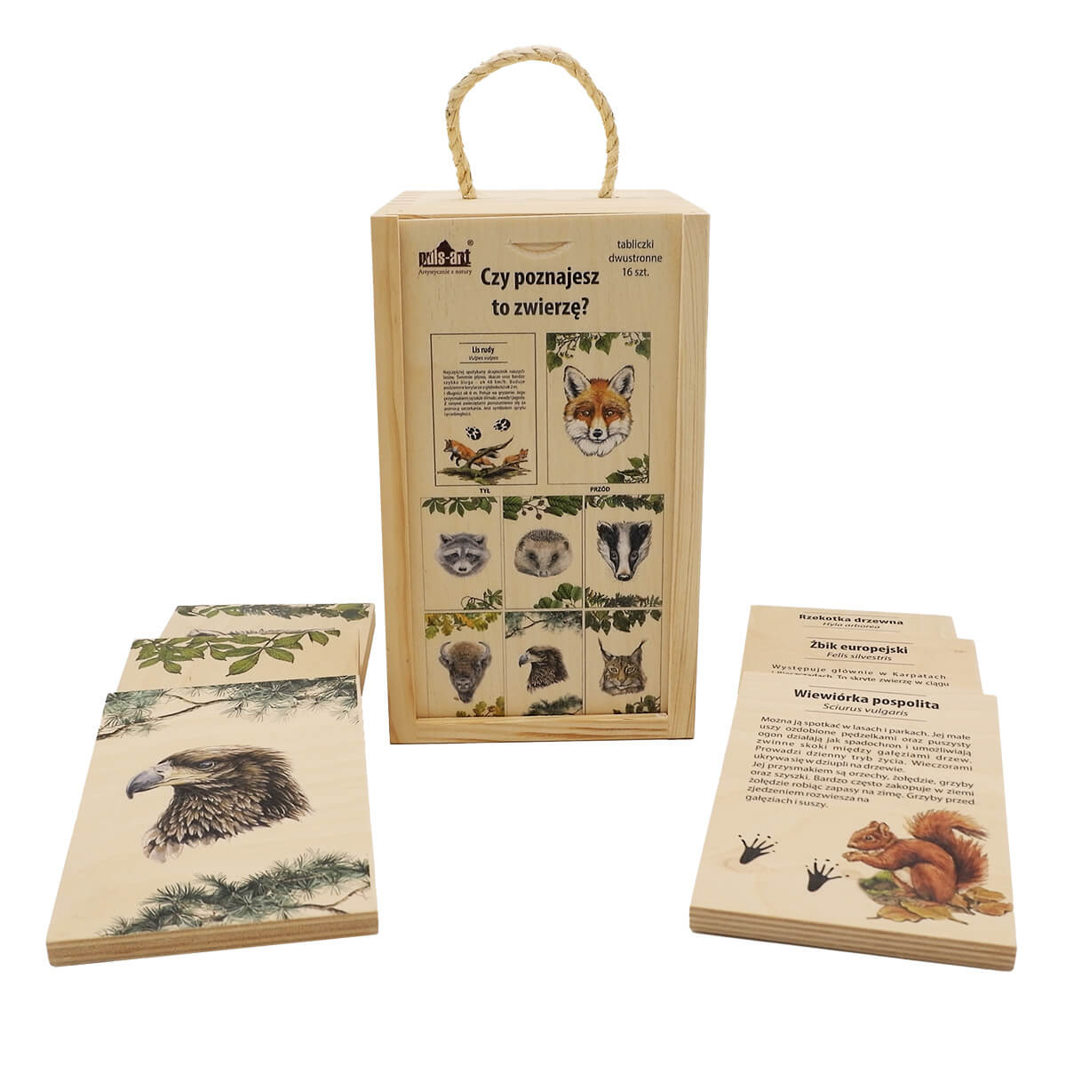 Puls Art Zestaw edukacyjny "Czy Poznajesz to Zwierzę?" to innowacyjna zabawka edukacyjna, stworzona z myślą o rozwijaniu umiejętności poznawczych oraz wiedzy o świecie przyrody wśród dzieci. Ten wyjątkowy komplet składa się z 16 dwustronnych, trwałych tabliczek, które prezentują fascynujący świat zwierząt takich jak lis, borsuk, jeż, żubr i wiele innych. Z jednej strony tabliczki znajdują się realistyczne obrazy zwierząt, zapraszające do poznania ich wyglądu, a z drugiej strony znajdziesz interesujące opisy, które wzbogacą wiedzę malucha o danym gatunku.