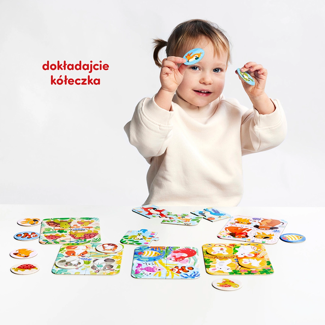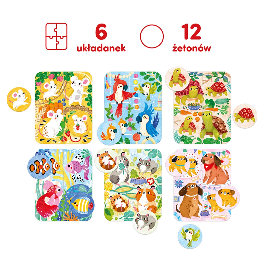 - 6 układanek po 4 elementy (24 puzzli) oraz 12 żetonów
