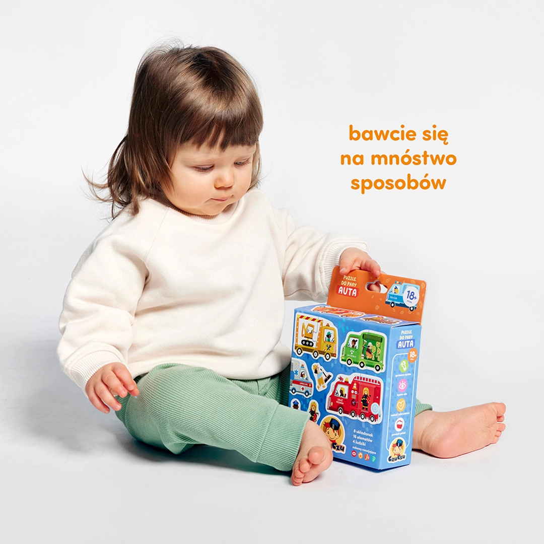 Puzzle do pary Auta to barwny zestaw edukacyjny dla najmłodszych, zaprojektowany z myślą o dzieciach od 18 miesiąca życia. Zestaw zawiera 8 prostych układanek, w których zadaniem dziecka jest połączenie pasujących do siebie ilustracji pojazdów i elementów z nimi związanych – np. wozu strażackiego i gaśnicy. Dzięki dużym, trwałym i łatwym do chwytania elementom, maluchy mogą ćwiczyć rączki i uczyć się poprzez zabawę. Puzzle edukacyjne rozwijają nie tylko zdolności manualne, ale także spostrzegawczość i umiejętność logicznego łączenia przedmiotów.