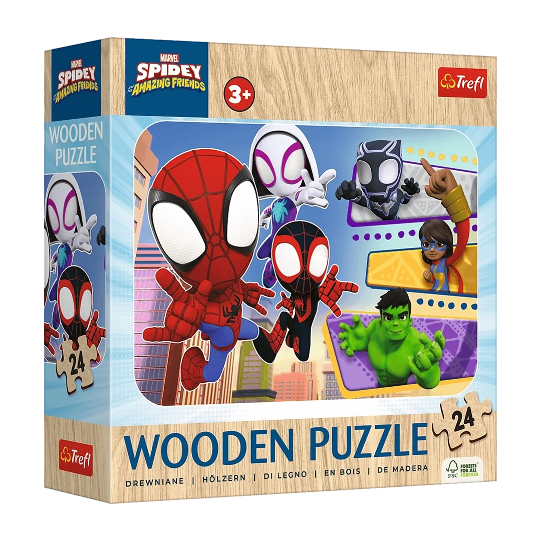 Puzzle drewniane Marvel to trwała i bezpieczna zabawka edukacyjna dla dzieci, która wspiera rozwój logicznego myślenia i koncentracji. Idealne puzzle dla dzieci od 3 lat z bohaterami Spidey i przyjaciele.