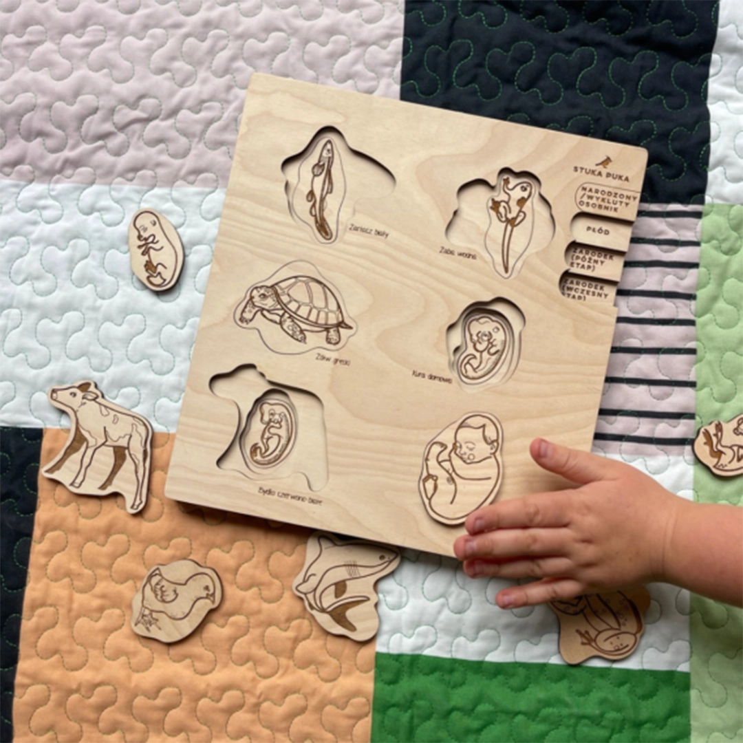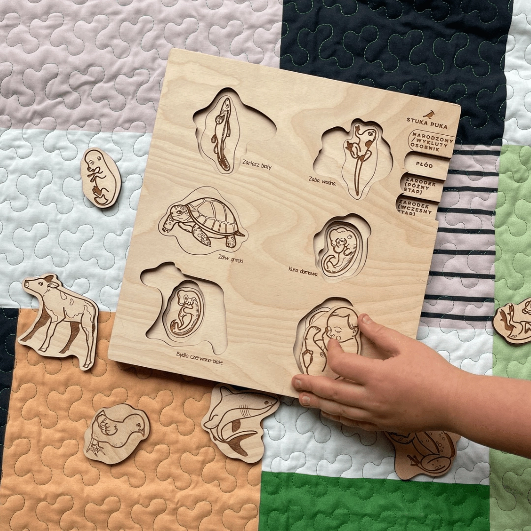 Puzzle drewniane Wszystkie dzieci nasze są od Sounds Wood to wyjątkowa zabawka edukacyjna, która w przystępny i angażujący sposób wprowadza dzieci w świat biologii, ewolucji i różnorodności gatunkowej. Poprzez układanie puzzli dziecko może prześledzić rozwój pięciu gatunków zwierząt od fazy zarodka aż do postaci dorosłej, co stanowi doskonałą okazję do nauki o podobieństwach między organizmami żywymi oraz fascynujących procesach zachodzących w przyrodzie.