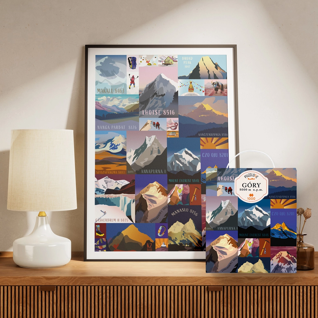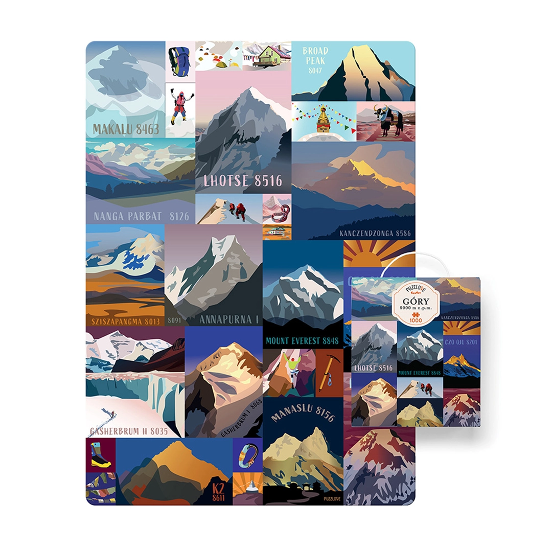 Puzzlove góry 8000 m n.p.m. to wyjątkowe puzzle od marki CzuCzu, które zabiorą Cię w inspirującą podróż przez najwyższe szczyty świata. Składająca się z 1000 elementów układanka przedstawia 14 ośmiotysięczników – majestatyczne góry, które zachwycają swoją potęgą i pięknem. To doskonała propozycja nie tylko dla miłośników puzzli, ale również dla osób zafascynowanych geografią, podróżami i światem przyrody.