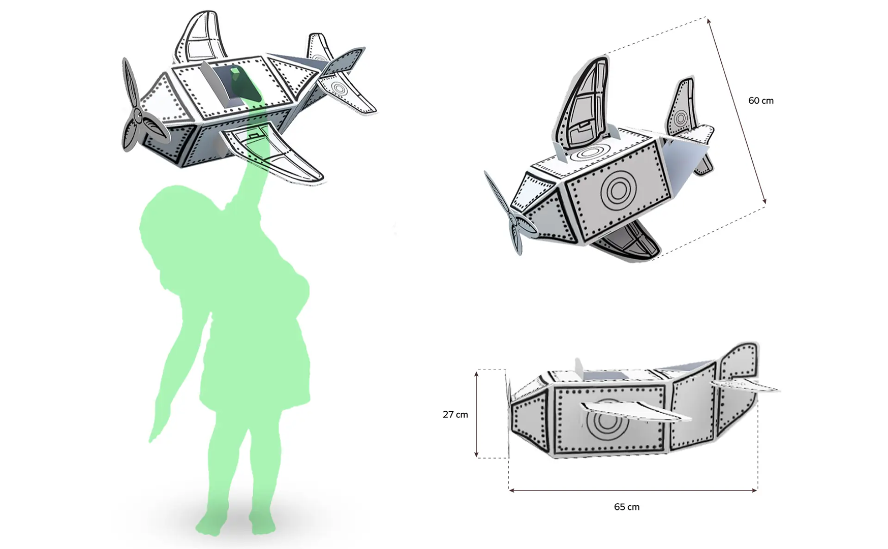 Nasza zabawka z kartonu "Samolot XS" to pole do popisu dla małych malarzy. Dzięki możliwości dowolnego kolorowania kredkami, flamastrami oraz malowania farbkami, każdy może dostosować tekturowy samolocik do własnej wizji artystycznej.