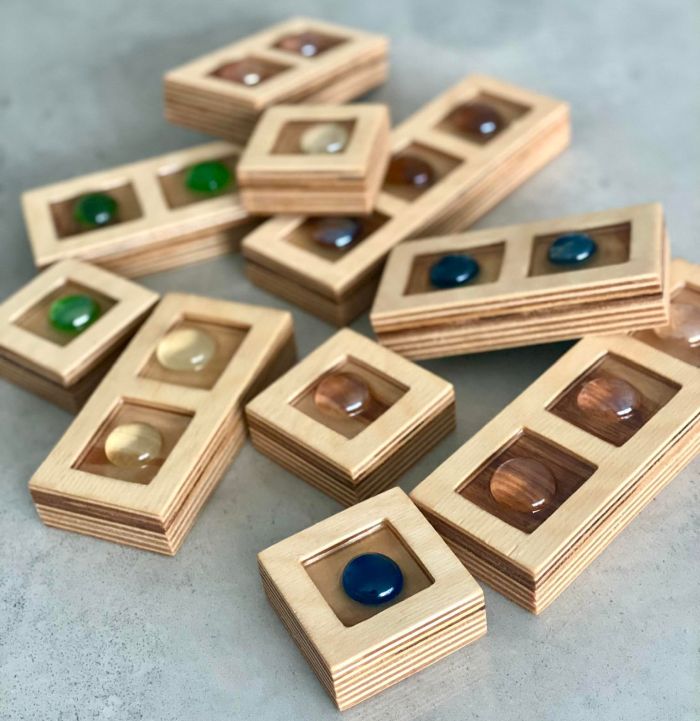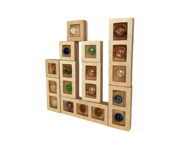 Klocki drewniane są lekkie, a dzięki szklanym kamieniom znajdującym się w okienkach - mienią się w słońcu. Dzieci mogą nazywać kształty i kolory, dotykajcie faktur i budując co tylko podpowie im wyobraźnia.