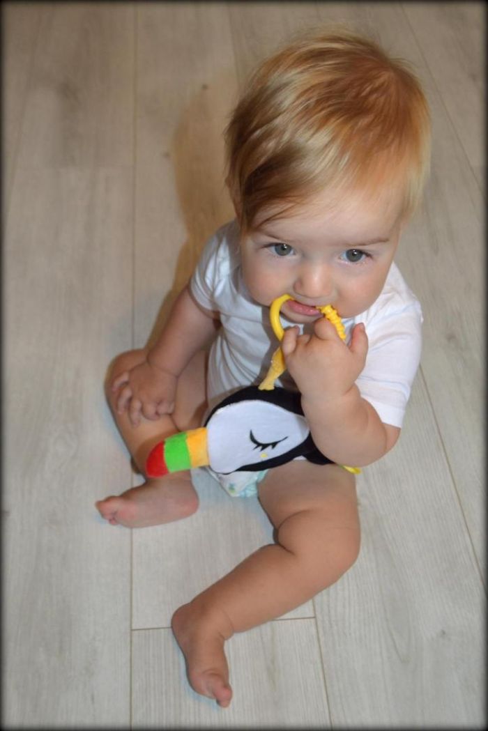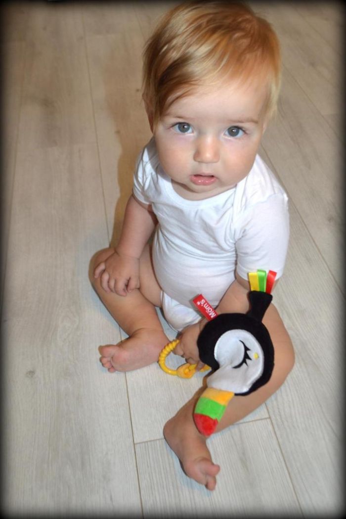 Zabawki sensoryczne doskonale wspierają rozwój zmysłów malucha. W końcu niemowlęta już od pierwszych dni życia obserwują i poznają świat za pomocą zmysłów. Najbardziej aktywny jest wzrok, słuch i dotyk. Zapewnij więc swojemu dziecku zdrowy rozwój, dając mu do zabawy zabawki sensoryczne. Szeleścik Tukado, w postaci przyjaznego ptaszka- tukana to połączenie przyjemnego z pożytecznym. Może służyć jako przytulanka do zasypiania albo do zabawy na co dzień, a przy tym będzie pełnić istotną funkcję. Dzięki temu, że zabawka jest wypełniona szeleszczącą folią, podczas dotykania jej wydaje dźwięki podobne do tych, które maluszek zna jeszcze z życia płodowego.