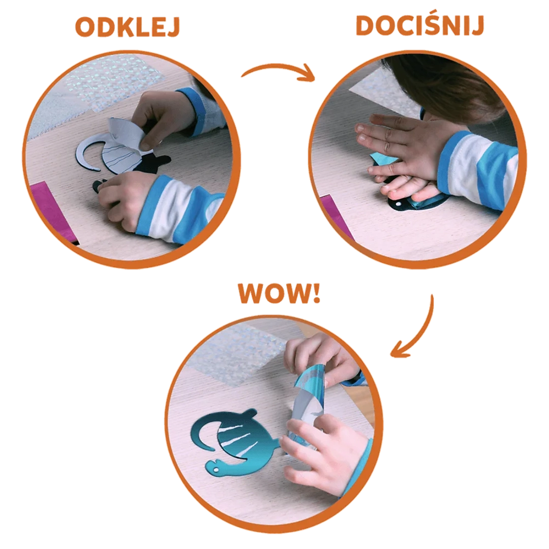 Tworzenie połyskujących, estetycznych obrazków poprawia także poczucie sprawczości i pewność siebie. Dzieci widzą szybki efekt swojej pracy, co motywuje je do kontynuowania zabawy i podejmowania kolejnych plastycznych wyzwań. Zestaw świetnie nadaje się również do wspólnych aktywności — rodzic może towarzyszyć dziecku, wspierając je w odklejaniu elementów i tworząc okazję do rozmowy.