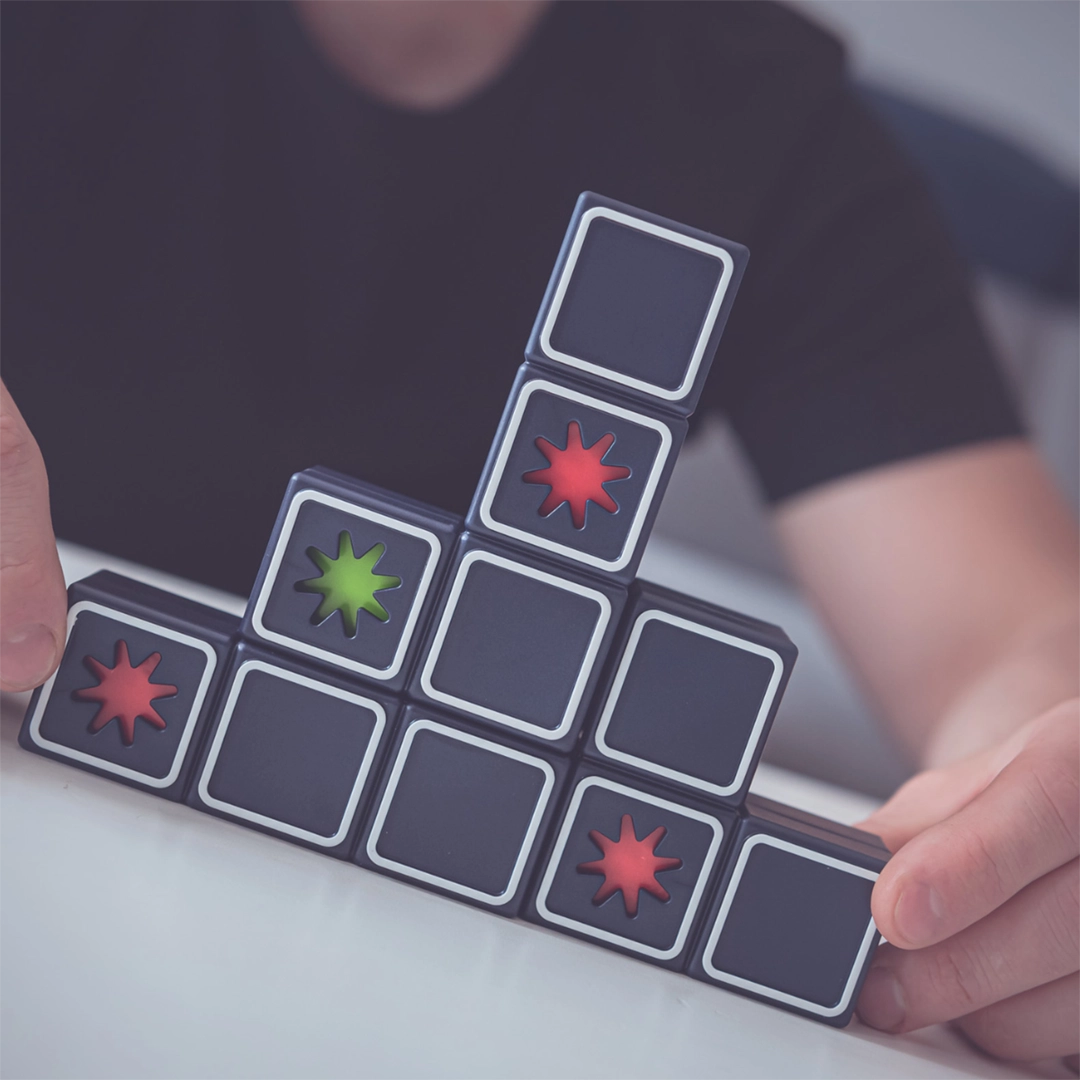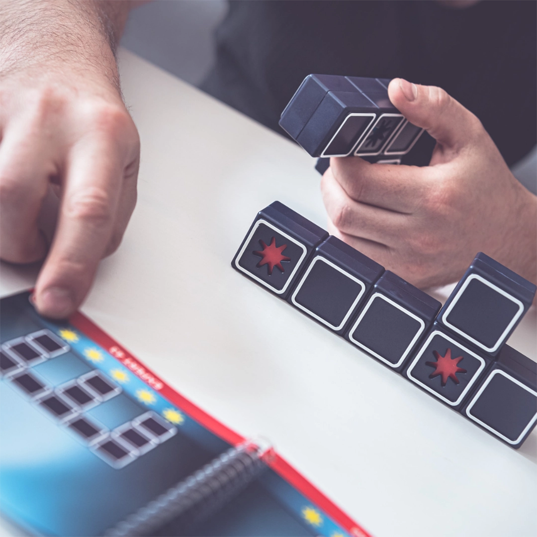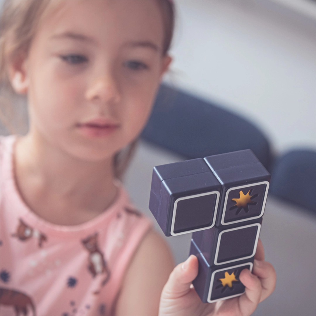 - Percepcja przestrzenna – ćwiczona poprzez manipulowanie dwustronnymi elementami i ich odpowiednie dopasowywanie.
