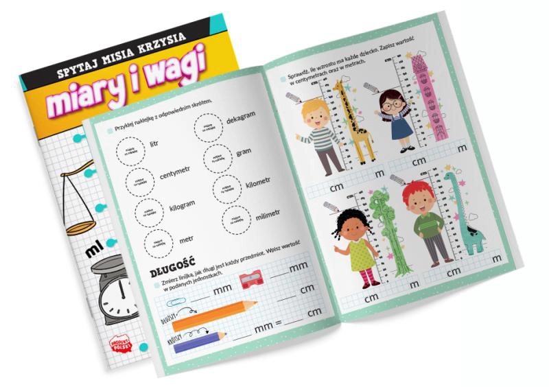 Spytaj Misia Krzysia: Miary i wagi z naklejkami" to edukacyjna książka dla dzieci, która łączy zabawę z nauką miar i wag.