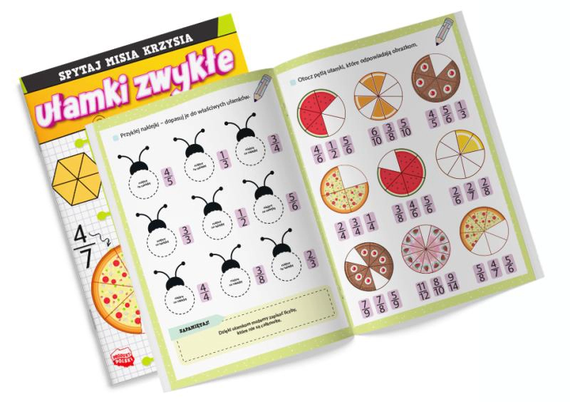 "Spytaj Misia Krzysia: UŁAMKI ZWYKŁE z naklejkami" to edukacyjna książka dla dzieci, która łączy zabawę z nauką ułamków zwykłych.