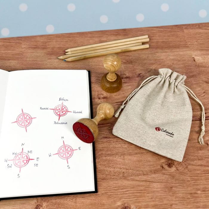 „Północ, wschód”… gdzie to było? Bez obaw, jeśli Twoje dziecko nie radzi sobie jeszcze z kompasem czy prawidłowym odczytywaniem współrzędnych geograficznych. Warto na moment wrócić do podstaw – umożliwia to edukacyjny stempel. Po odbiciu za pomocą pieczątki tarczy kompasu wystarczy już tylko podpisać kierunki! Kto wie – może już po godzinie nauki nadejdzie czas na słynne „podchody” w terenie?