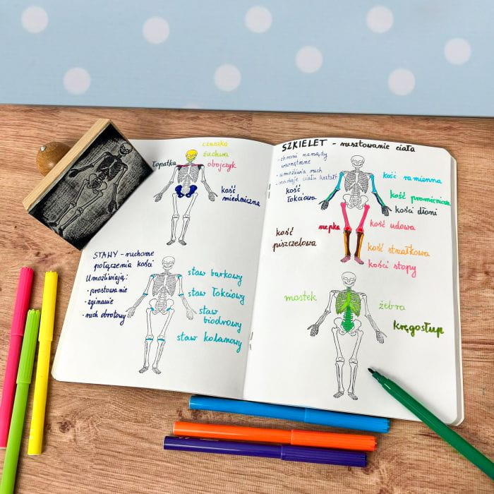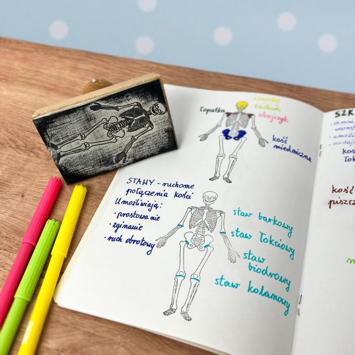 Stempel z układem szkieletowym przyda się na lekcjach przyrody czy biologii, a nawet: na wykładach. W zeszycie A4 zmieszczą się aż dwie pionowe ilustracje – resztę strony wystarczy wypełnić tekstem. Gadżet wspomoże naukę u „wzrokowców”, usprawni notowanie i pozwoli ograniczyć korzystanie z drukarki. Własnoręcznie sporządzanie notatek to pierwszy krok ku sprawnemu zapamiętaniu nowych terminów!