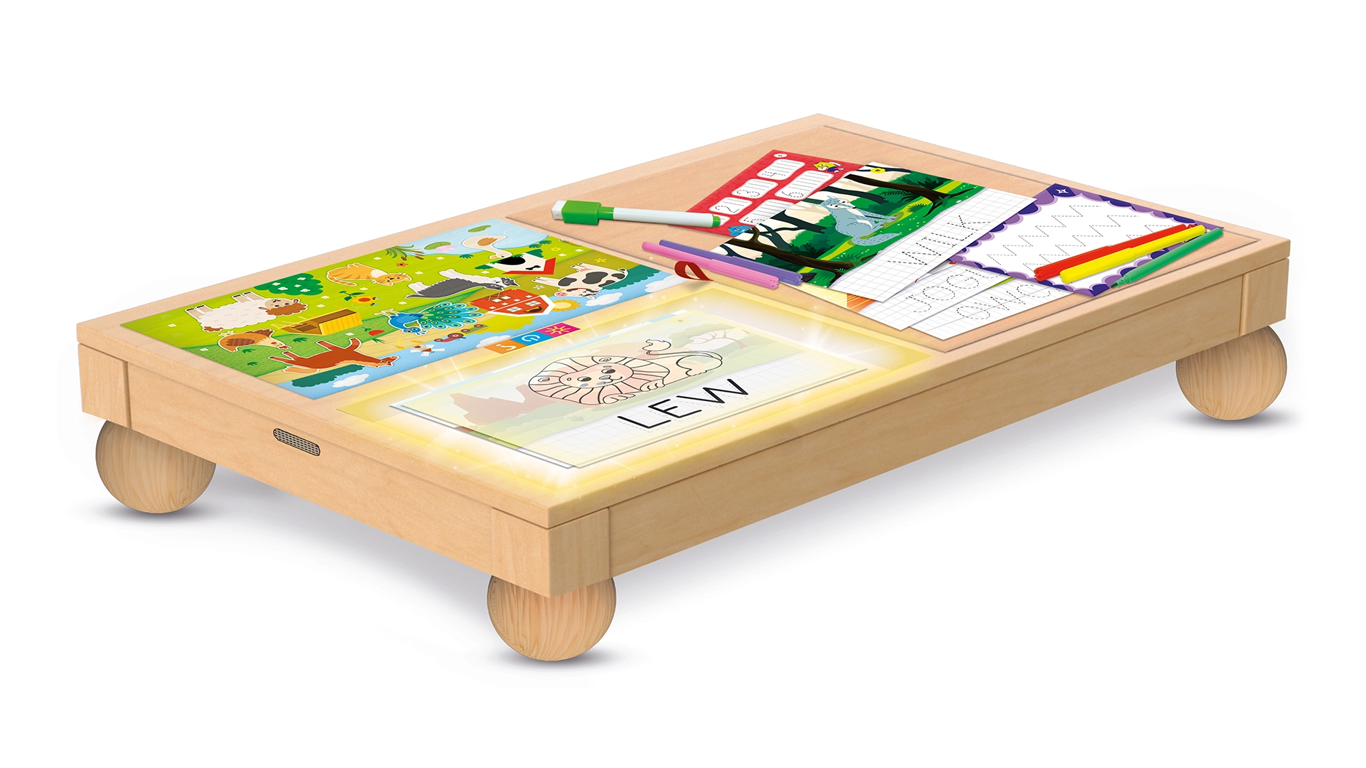 Zestaw pełni aż trzy funkcje w jednym – to biurko do rysowania, stolik edukacyjny oraz miejsce do przechowywania akcesoriów. Dzięki podświetlanemu blatowi LED dziecko może swobodnie rysować, pisać i odwzorowywać kształty, co wspiera rozwój motoryki małej, koncentracji i koordynacji wzrokowo-ruchowej.