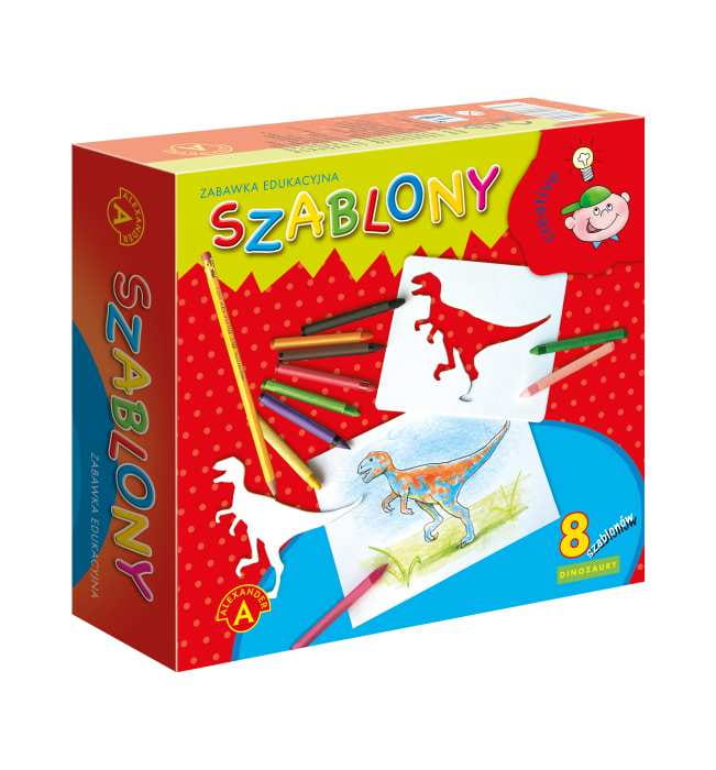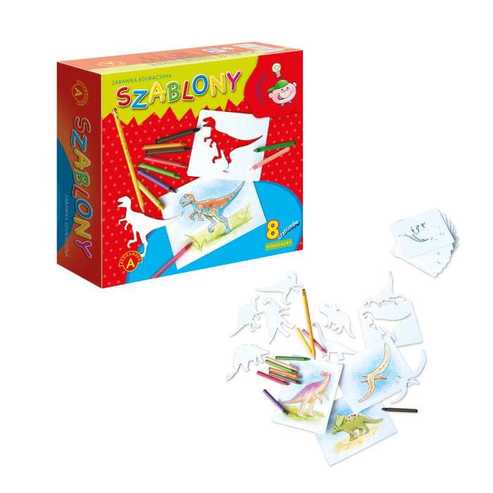 Kolorowy zestaw Szablony Dinozaury zawiera 8 szablonów wewnętrznych i zewnętrznych, 12 kredek, ołówek oraz bloczek do rysowania. To idealna zabawka kreatywna dla dzieci od 4 lat, która pozwala tworzyć własne ilustracje prehistorycznych stworzeń i rozwijać artystyczne pasje.