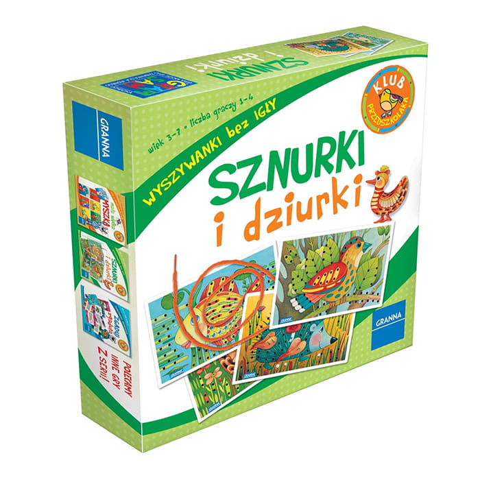 Zawartość pudełka obejmuje 4 plansze do przewlekania, 8 kolorowych sznurków oraz instrukcję, która pomaga wprowadzić maluchy w świat zabawy. Zabawka "Sznurki i dziurki" jest odpowiednia dla dzieci od 3 roku życia, zapewniając im edukacyjną i angażującą rozrywkę.