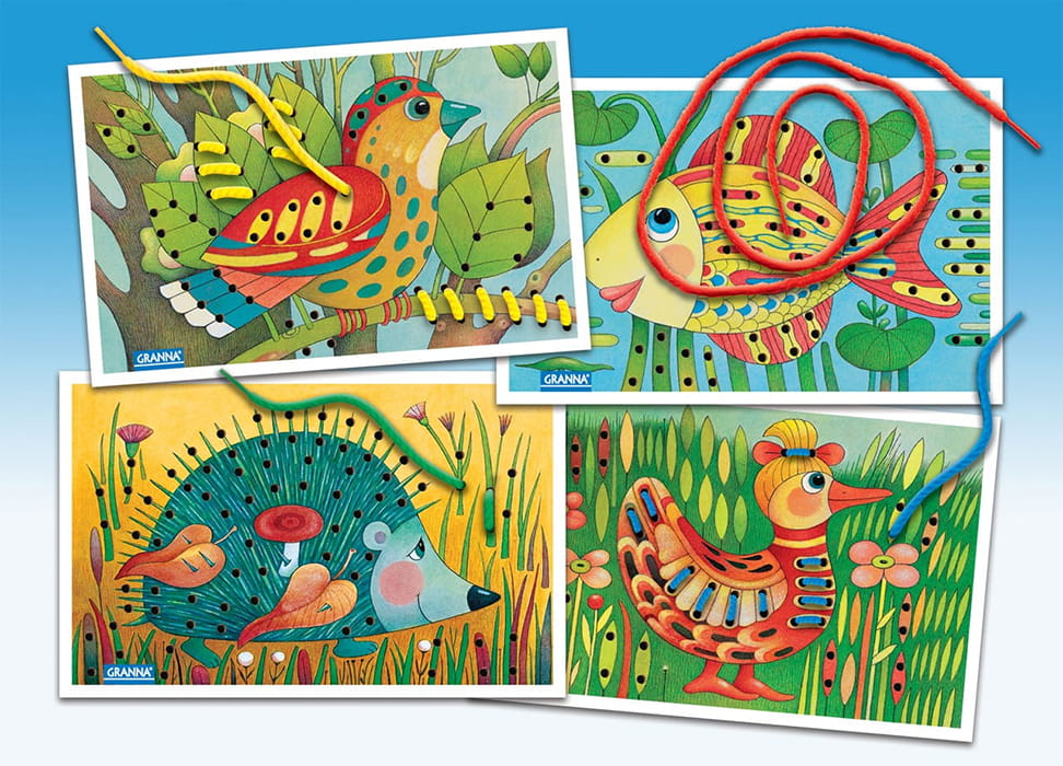 Wyszywanki bez igły to wspaniałe ćwiczenie dla małych rączek. Dziecko przewleka sznurek przez dziurki, korzystając z jednego lub kilku sznurków. Za każdym razem ten sam obrazek nabiera nowego wyglądu, dając dzieciom możliwość kreatywnego eksperymentowania.
