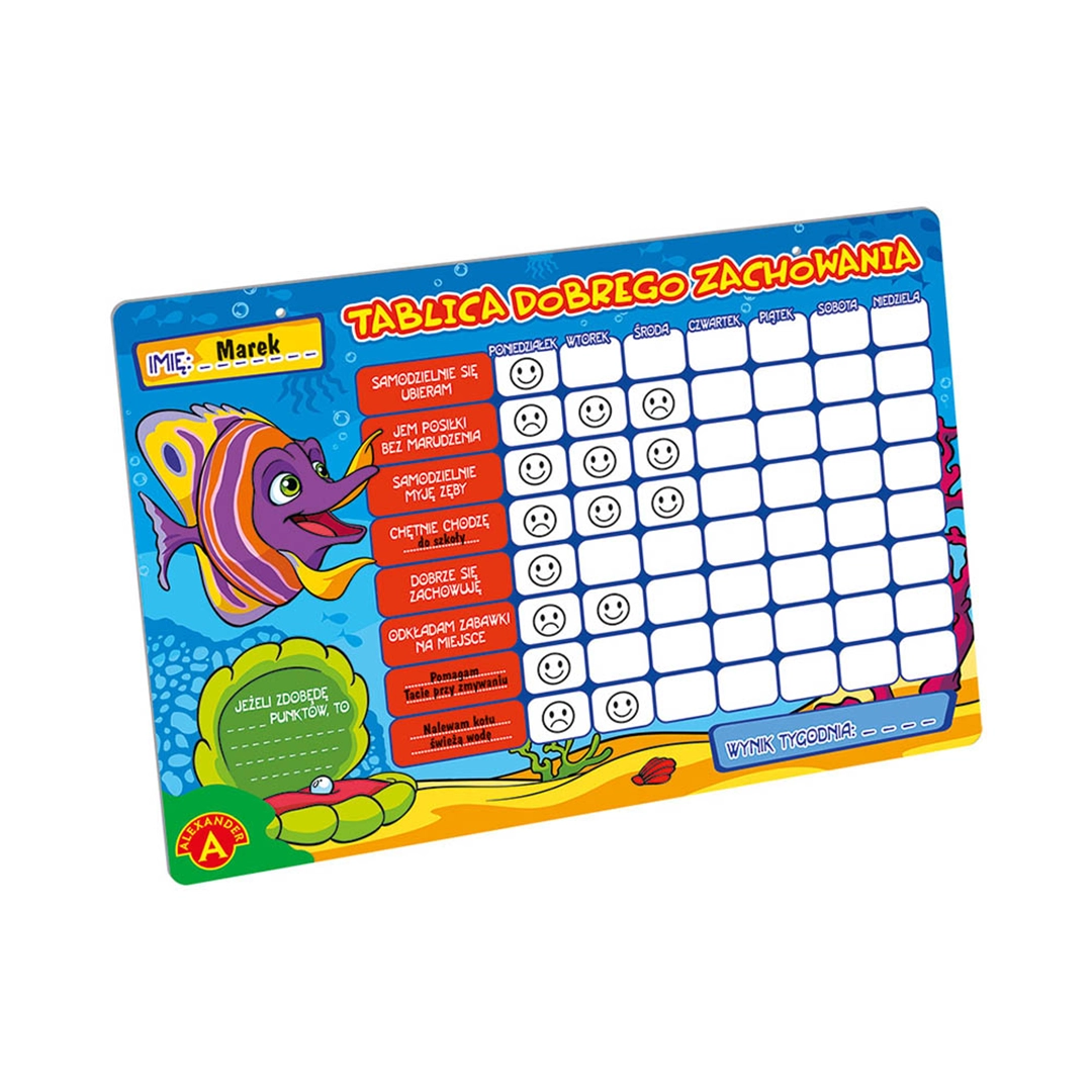 Tablica o wymiarach 30 × 21 cm (format A4), pokryta warstwą magnetyczną, z 112 magnesami w postaci zielonej rybki (plus) i czerwonej kotwicy (minus), oraz mazakiem z gąbką. Umożliwia notowanie osiągnięć i błędów w zadanych kategoriach, by motywować dziecko do dobrego zachowania.