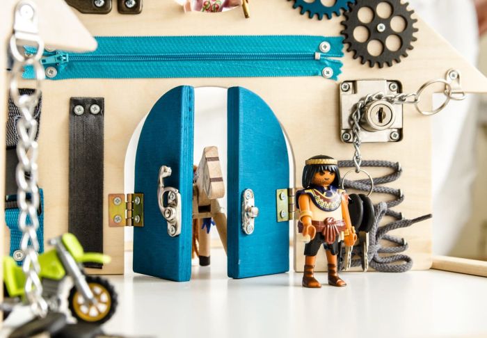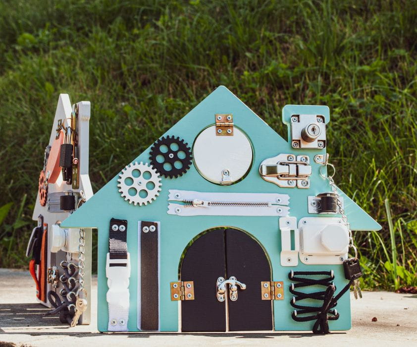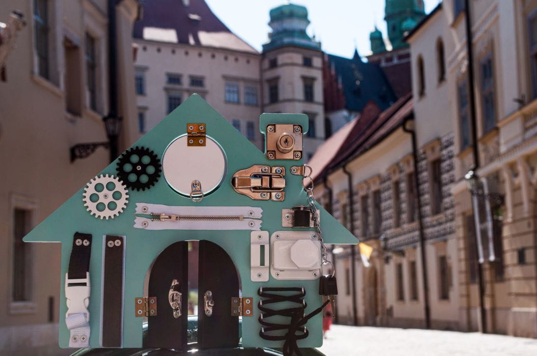 Kolorowy świat domków to wspaniałe tablice w małym rozmiarze (wymiary to 29 x 37 cm). Idealne na wycieczki, wyjazdy i wszędzie tam, gdzie chcemy zająć naszą pociechę na dłuższą chwilę. Dodatkowo zabawka pomoże dziecku rozwinąć motorykę i wyobraźnię. Tablica posiada wiele wspaniałych elementów które dzieci uwielbiają w naszym dorosłym życiu. Które dziecko nie lubi zamków? Albo suwaków na ubrania? Wszystko co się otwiera i zamyka, przesuwa jest wspaniałym zajęciem a przy okazji w kolorowej wersji jeszcze bardziej przyciąga uwagę dziecka.