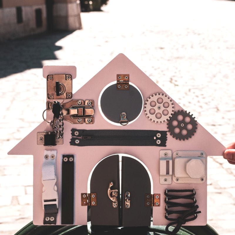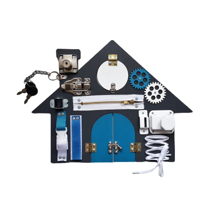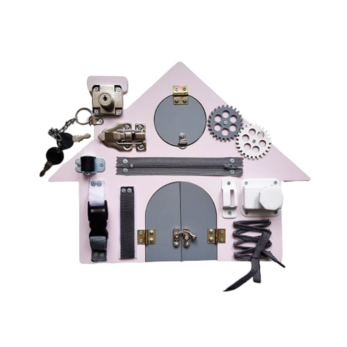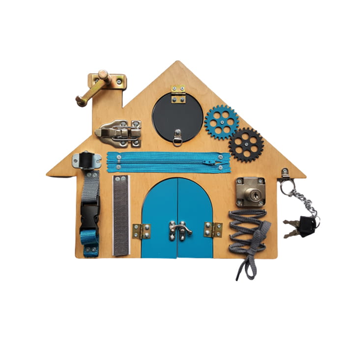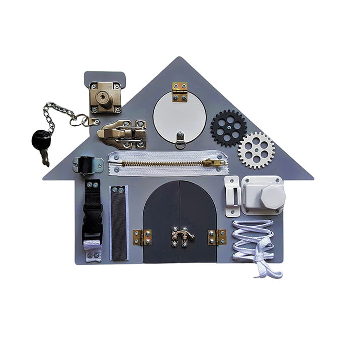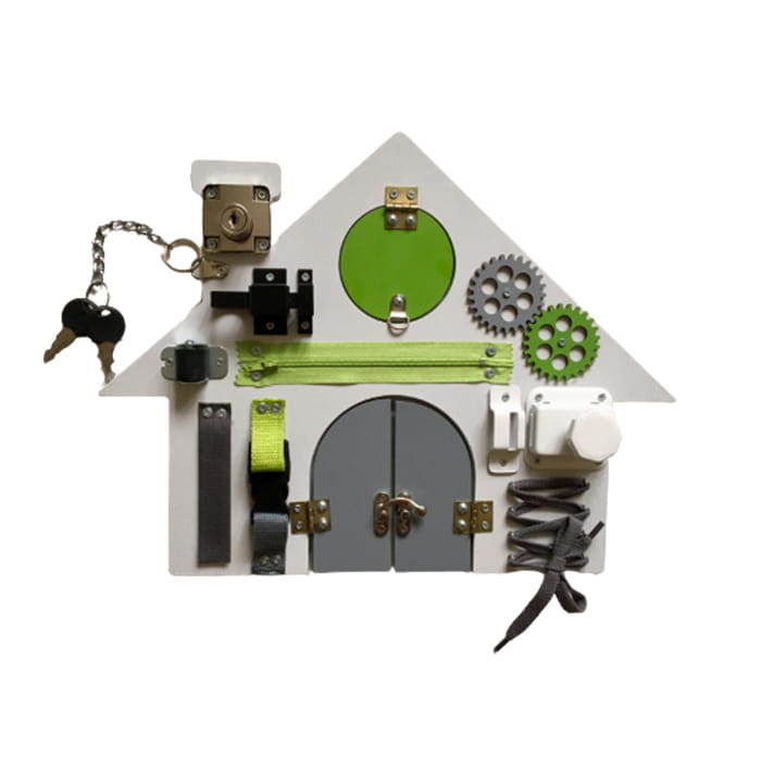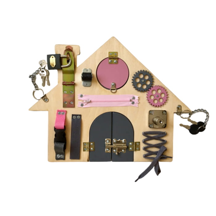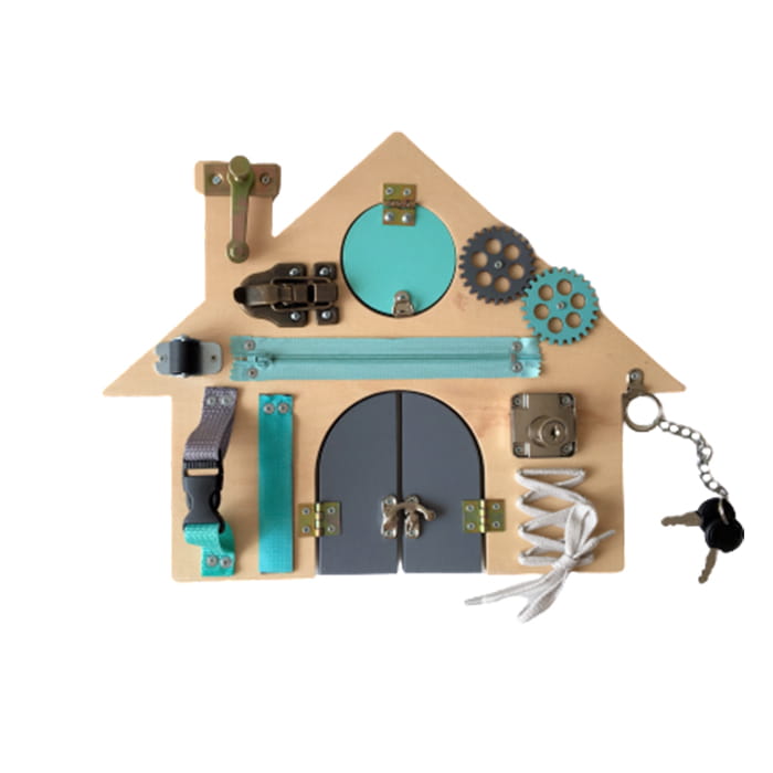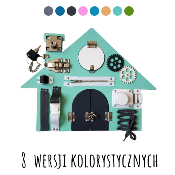 Drewniana tablica manipulacyjna sensoryczna Montessori dla dzieci w kształcie domku dostępna w 8 wersjach kolorystycznych