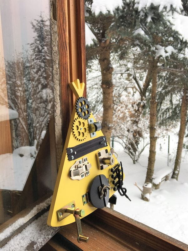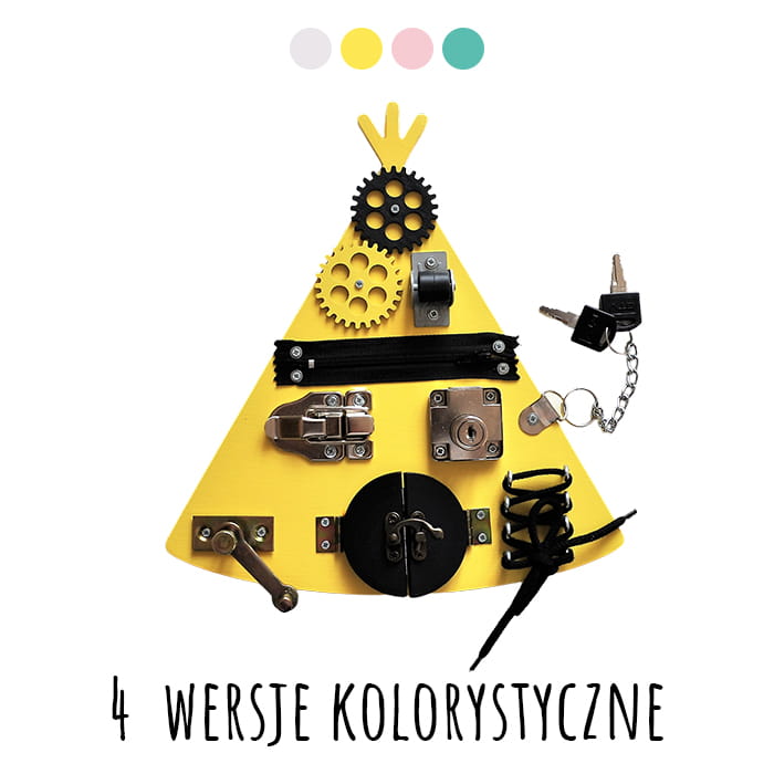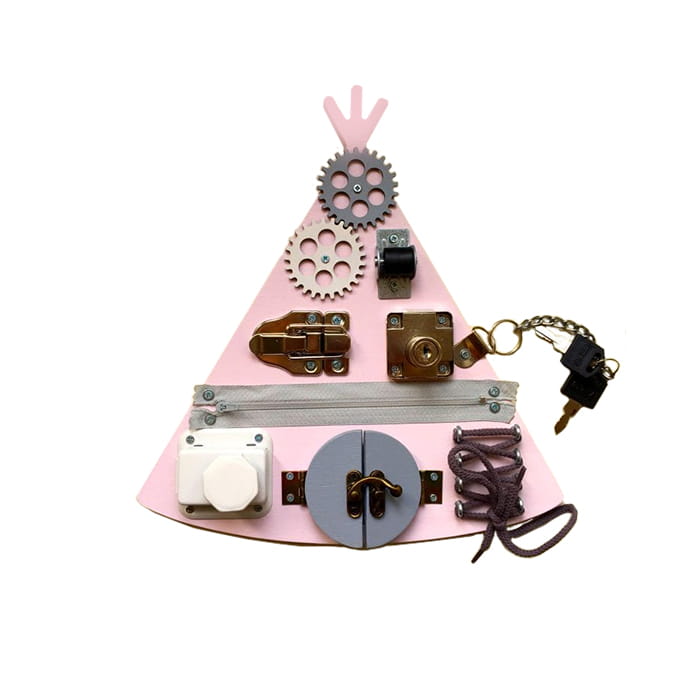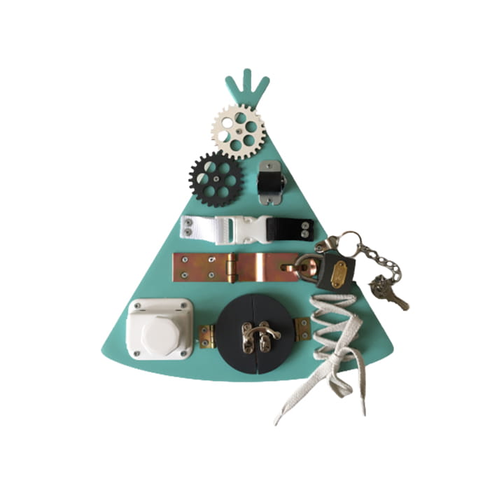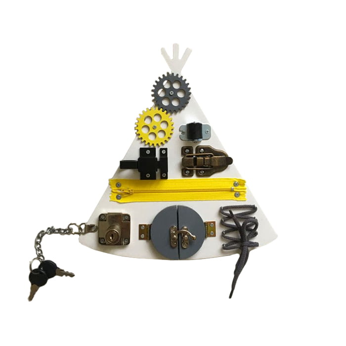 Dla małych miłośników wielkich przygód oferujemy wspaniałe mini tablice manipulacyjne w kształcie indiańskiego tipi. Ta kompaktowa tablica manipulacyjna, wykonana własnoręcznie, doskonale sprawdza się podczas wyjazdów i wszędzie tam gdzie niezbędne jest zajęcie czasu naszej pociechy. Za sprawą małych rozmiarów (26x28 cm ) możemy zabawkę mieć zawsze pod ręką.