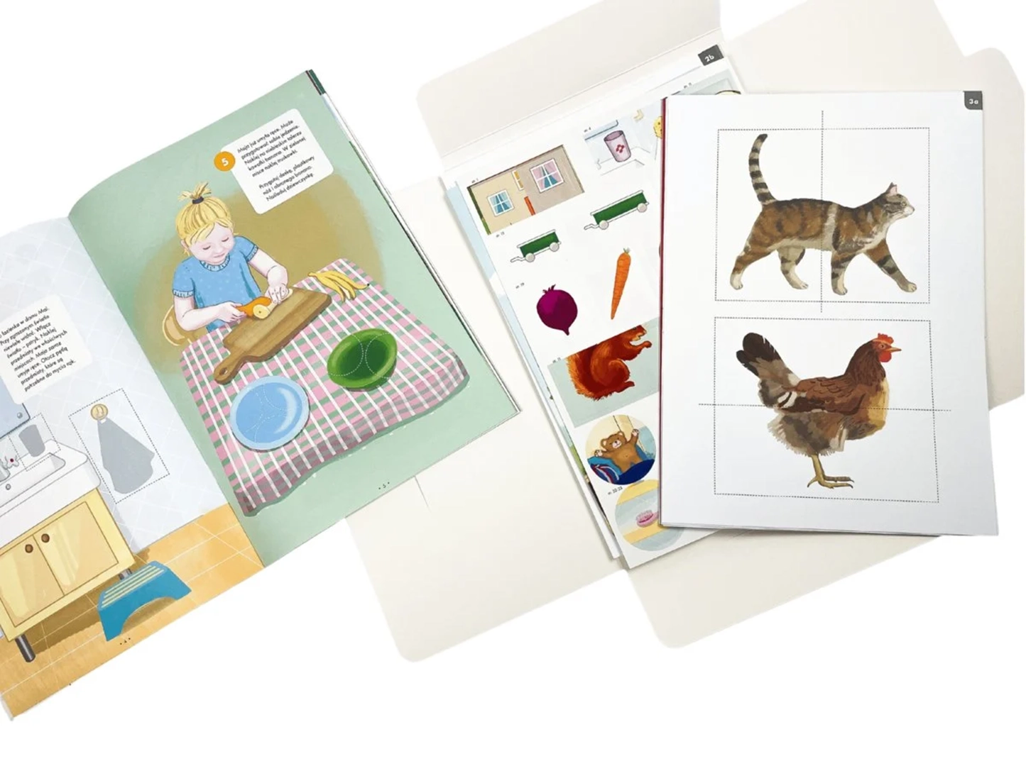Elementy zestawu zostały zaprojektowane z uwzględnieniem potrzeb najmłodszych – duże, kolorowe ilustracje, realistyczne obrazki i tematy bliskie codzienności dzieci sprawiają, że nauka staje się naturalną częścią dnia. Materiały pomagają dorosłym wprowadzić dziecko w świat Montessori poprzez codzienne aktywności rozwijające samodzielność, ciekawość i wrażliwość na otaczający świat.