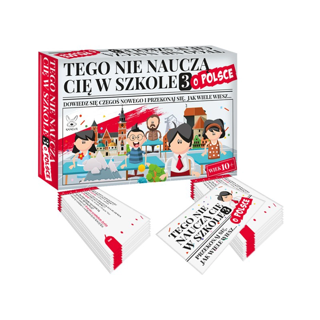 Tego nie nauczą Cię w szkole 3 o Polsce to gra edukacyjna od Kangur, pełna fascynujących pytań i ciekawostek o Polsce. Przeznaczona dla graczy od 10. roku życia.