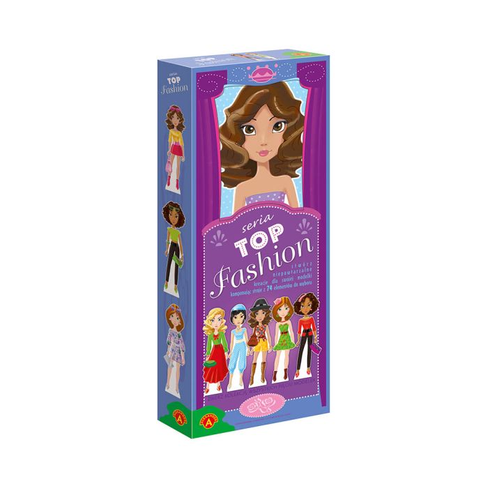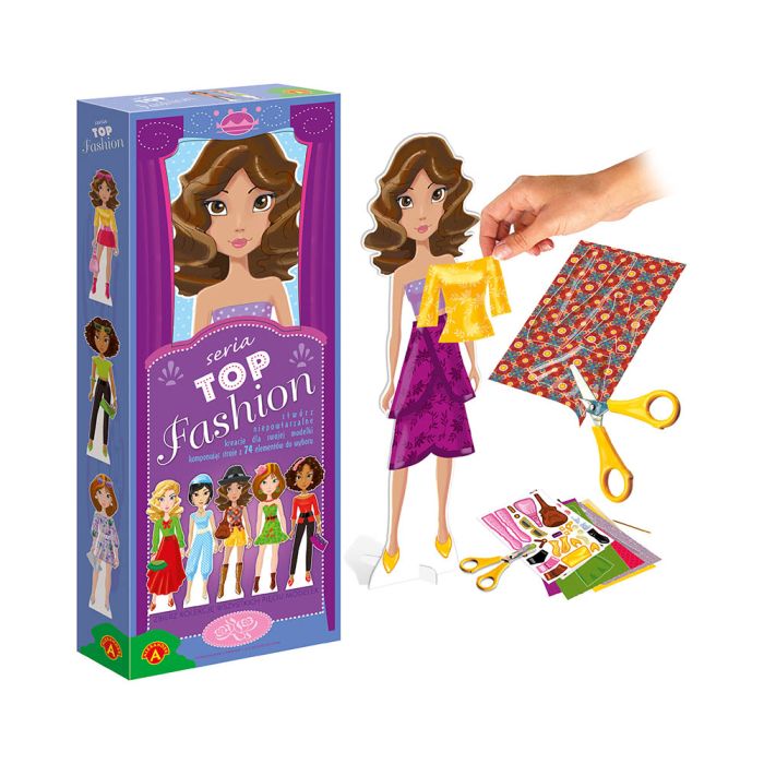 Zestaw Top Fashion – Modelka 4 marki Alexander to idealna zabawka kreatywna dla dziewczynek. W środku znajduje się tekturowa lalka, plansze do wycinania, samoprzylepne elementy i taśma dwustronna, dzięki którym można tworzyć niepowtarzalne stroje dla modelki.