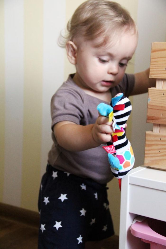 W górnej części zabawki został umieszczony piszczek, który wydaje miły i kojący dla dziecka dźwięk. Nie tylko go uspokaja, ale również stymuluje słuch. Oprócz tego zabawka składa się z wielu małych fragmentów materiałów, które zachęcają dziecko do łapania ich.