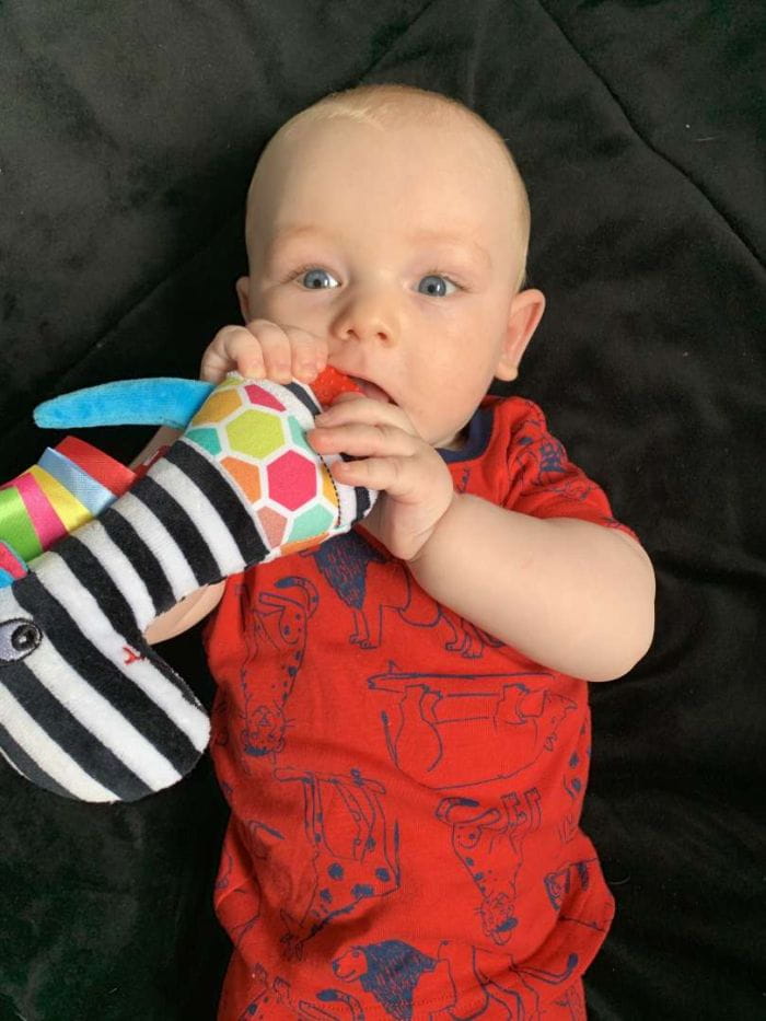 Tymek piszczek z gryzakiem – kontrastowa zabawka sensoryczna dla niemowląt