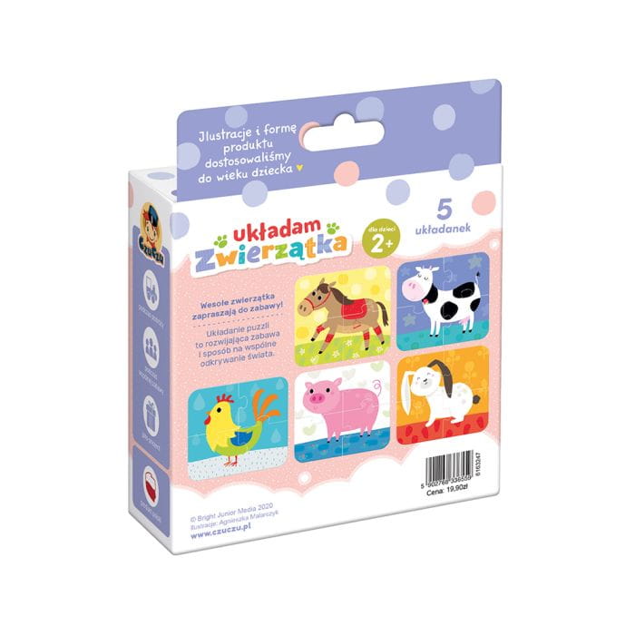 Zestaw CzuCzu Układam Zwierzątka składa się z 20 elementów, które pozwalają na ułożenie 5 obrazków z wizerunkiem zwierząt gospodarskich. Rozmiar, kształt i kolorystyka puzzli są dostosowane do bezpieczeństwa i zdolności maluchów. Zestaw jest przeznaczony dla dzieci już od 2 roku życia. Wszystkie elementy są wykonane z wytrzymałej tektury oraz są starannie wykończone, dzięki czemu ich żywotność i estetyczny wygląd są długie!