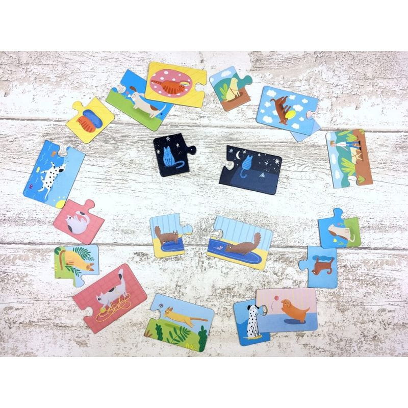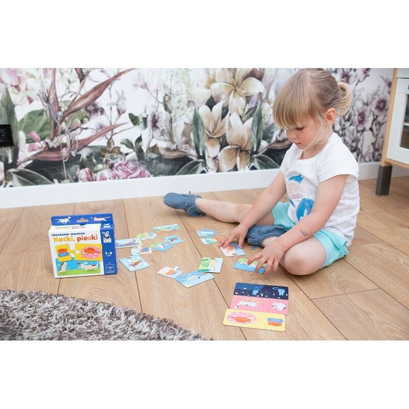 Przygotowane przez Monikę Rejkowską, barwne i pełne szczegółów ilustracje, przedstawiające koty i psy w różnorodnych, codziennych sytuacjach - od zabawy, przez spacery, aż po chwile odpoczynku - przykują uwagę Twojego dziecka i pozwolą mu lepiej zrozumieć świat zwierząt domowych. Każdy element układanki został zaprojektowany z myślą o małych rączkach, co ułatwia dopasowywanie i sprawia, że puzzle są idealne dla maluchów.