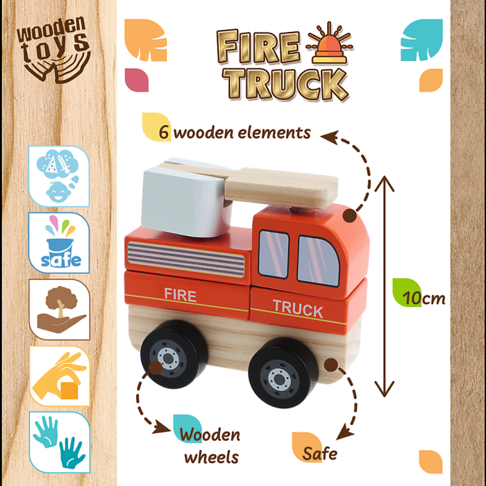 Już dziś Wasza pociecha może zostać małym strażakiem i mknąć na sygnale na pomoc innym. Nasz drewniany wóz strażacki to niepowtarzalna okazja by połączyć zabawę z kształtowaniem pewnych nawyków, umiejętności i zachowań. Drewniany samochód składa się z kilku klocków, które należy umieścić na właściwym miejscu nakładając na drewniany drążek. Dzięki temu rozwiązaniu dziecko uczy się logicznego oraz przestrzennego myślenia, rozwija koordynację wzrokowo-ruchową, małą motorykę oraz precyzję. Odruch chwytania, cierpliwość, a także wyobraźnia również zostają pobudzone. Koncentrując się na stworzeniu wymarzonego drewnianego pojazdu mały strażak poznaje budowę drewnianej straży. Drewniane autko wyprodukowano z drewna z polskich lasów. Krajowi rzemieślnicy zadbali o to by było przyjazne zarówno dzieciom jak i środowisku, dlatego pokryli je spełniającymi europejskie normy farbami.
