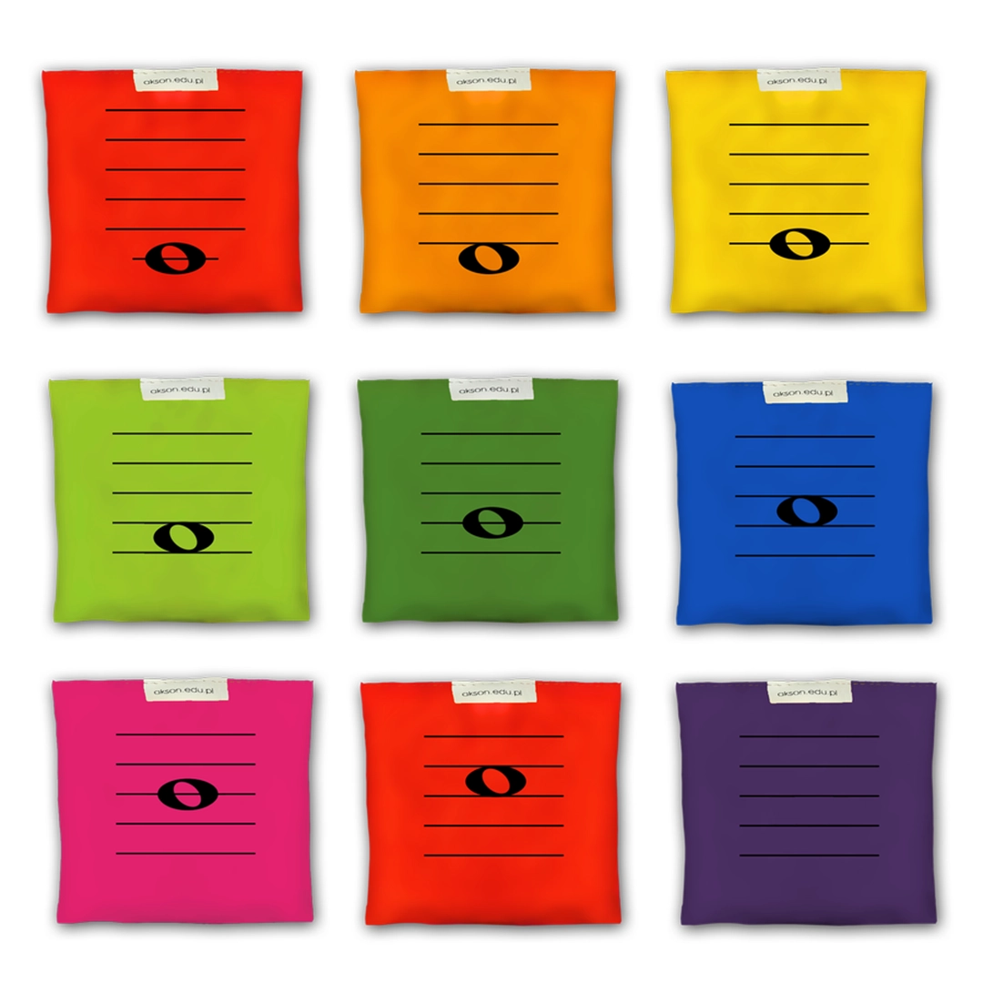 Woreczki gimnastyczne Akson ZESTAW NUTKI na pięciolinii to zestaw 9 kolorowych woreczków z motywem nut na pięciolinii, idealnych do ćwiczeń ruchowych, zabaw edukacyjnych oraz zajęć muzycznych.