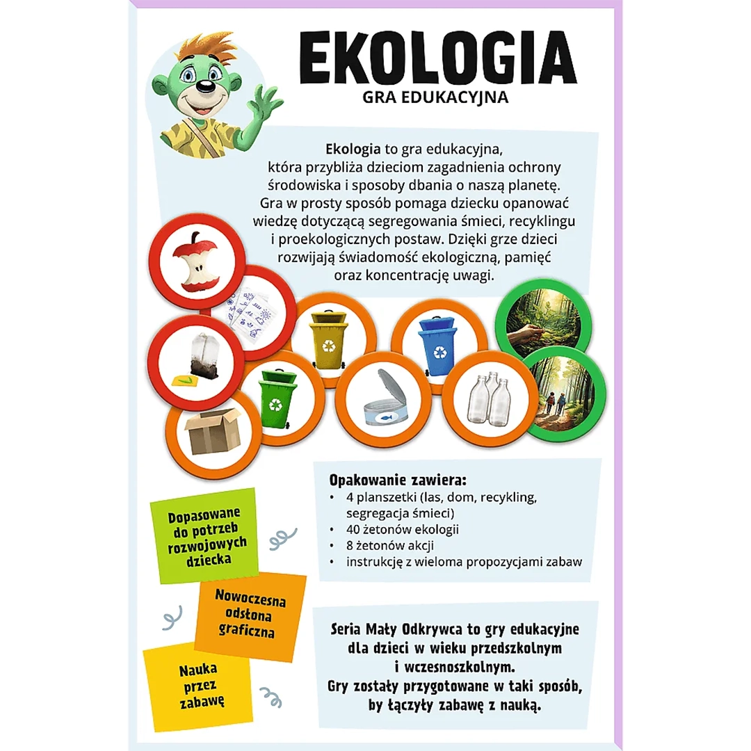 Jak w przystępny sposób wytłumaczyć dziecku, dlaczego warto dbać o środowisko? Gra edukacyjna Ekologia z serii Mały Odkrywca to idealny przewodnik dla najmłodszych po świecie ochrony przyrody. Dzięki niej maluchy dowiadują się, jak segregować odpady, oszczędzać wodę i energię oraz dlaczego każdy, nawet najmniejszy gest ma znaczenie dla naszej planety. To pozycja obowiązkowa w biblioteczce każdego świadomego rodzica i małego ekologa!