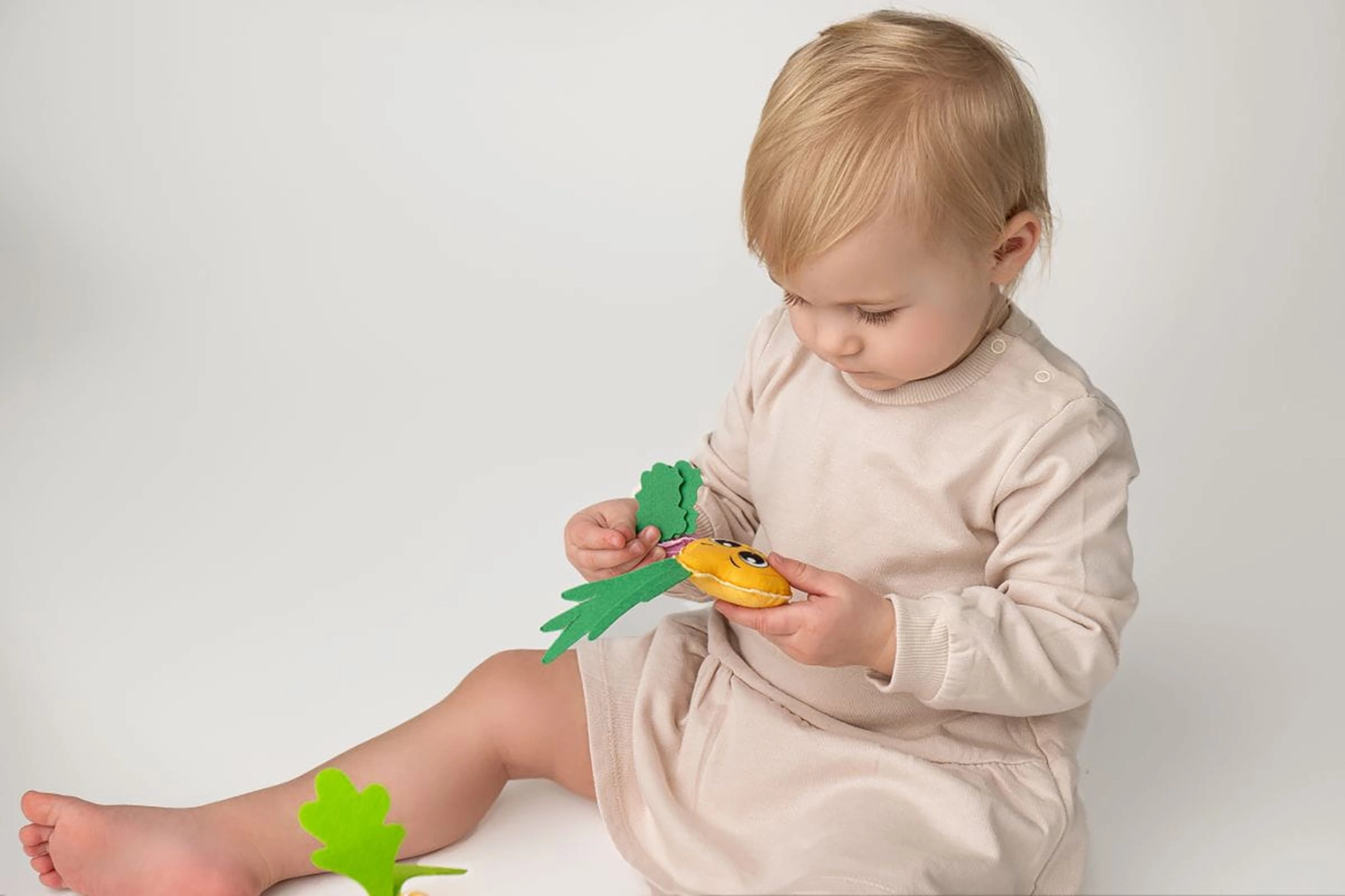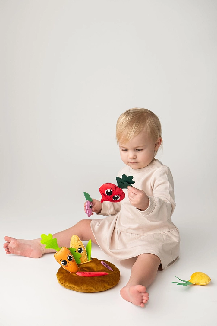 Zestaw „Ogródek warzywny” składa się z realistycznych, miękkich warzyw wykonanych z bezpiecznych materiałów, które dziecko może „sadzać” i „zbierać” w specjalnie zaprojektowanym materiałowym ogrodzie. Każdy element zestawu został starannie wykonany, aby oddać jak najwięcej szczegółów, co nie tylko uczy rozpoznawania różnych warzyw, ale także rozwija zmysł dotyku oraz wyobraźnię.